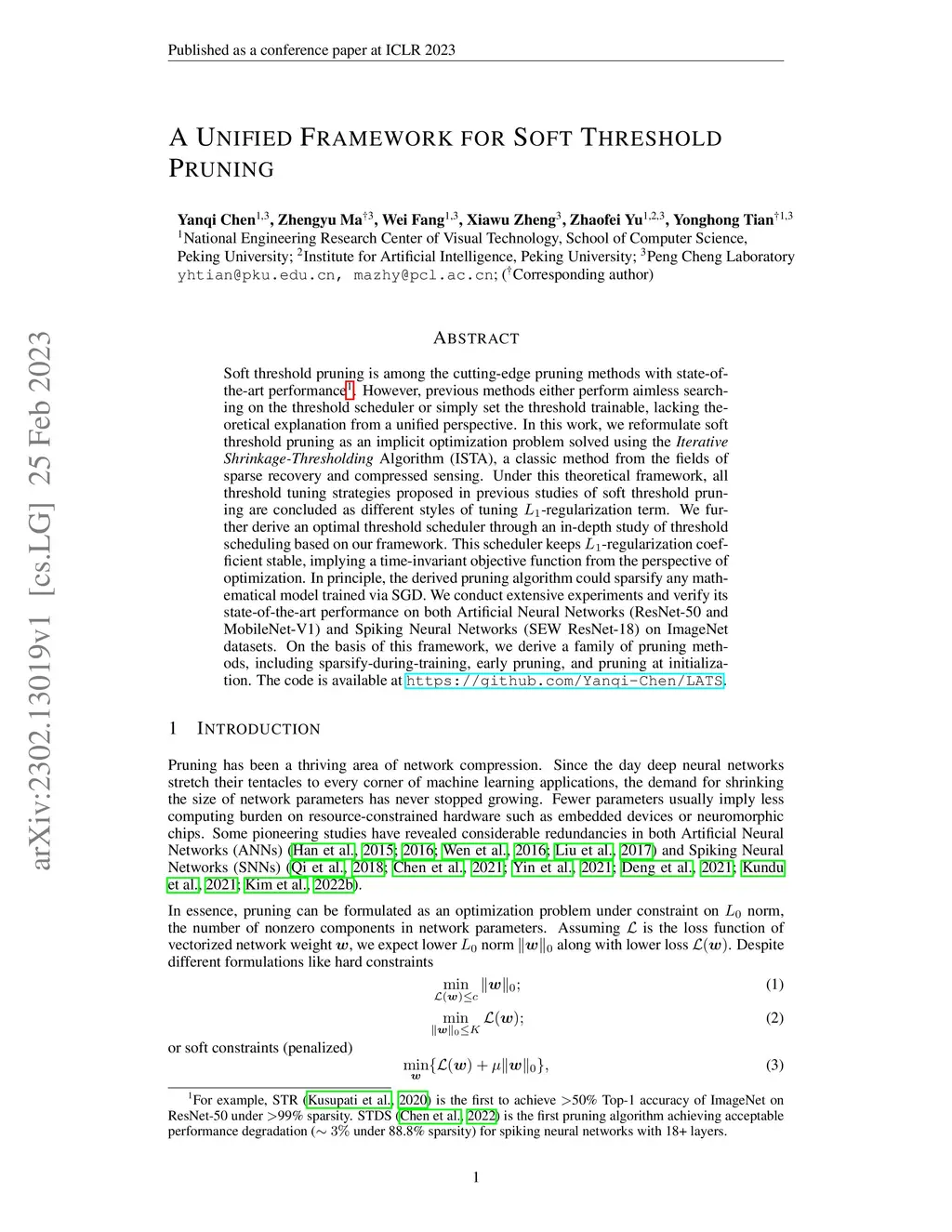 Soft threshold pruning is among the cutting-edge pruning methods with state-of-the-art performance. However, previous methods either perform aimless searching on the threshold scheduler or simply set the threshold trainable, lacking theoretical explanation from a unified perspective. In this work, we reformulate soft threshold pruning as an implicit optimization problem solved using the Iterative Shrinkage-Thresholding Algorithm (ISTA), a classic method from the fields of sparse recovery and compressed sensing. Under this theoretical framework, all threshold tuning strategies proposed in previous studies of soft threshold pruning are concluded as different styles of tuning -regularization term. We further derive an optimal threshold scheduler through an in-depth study of threshold scheduling based on our framework. This scheduler keeps -regularization coefficient stable, implying a time-invariant objective function from the perspective of optimization. In principle, the derived pruning algorithm could sparsify any mathematical model trained via SGD. We conduct extensive experiments and verify its state-of-the-art performance on both Artificial Neural Networks (ResNet-50 and MobileNet-V1) and Spiking Neural Networks (SEW ResNet-18) on ImageNet datasets. On the basis of this framework, we derive a family of pruning methods, including sparsify-during-training, early pruning, and pruning at initialization. The code is available at https://github.com/Yanqi-Chen/LATS.