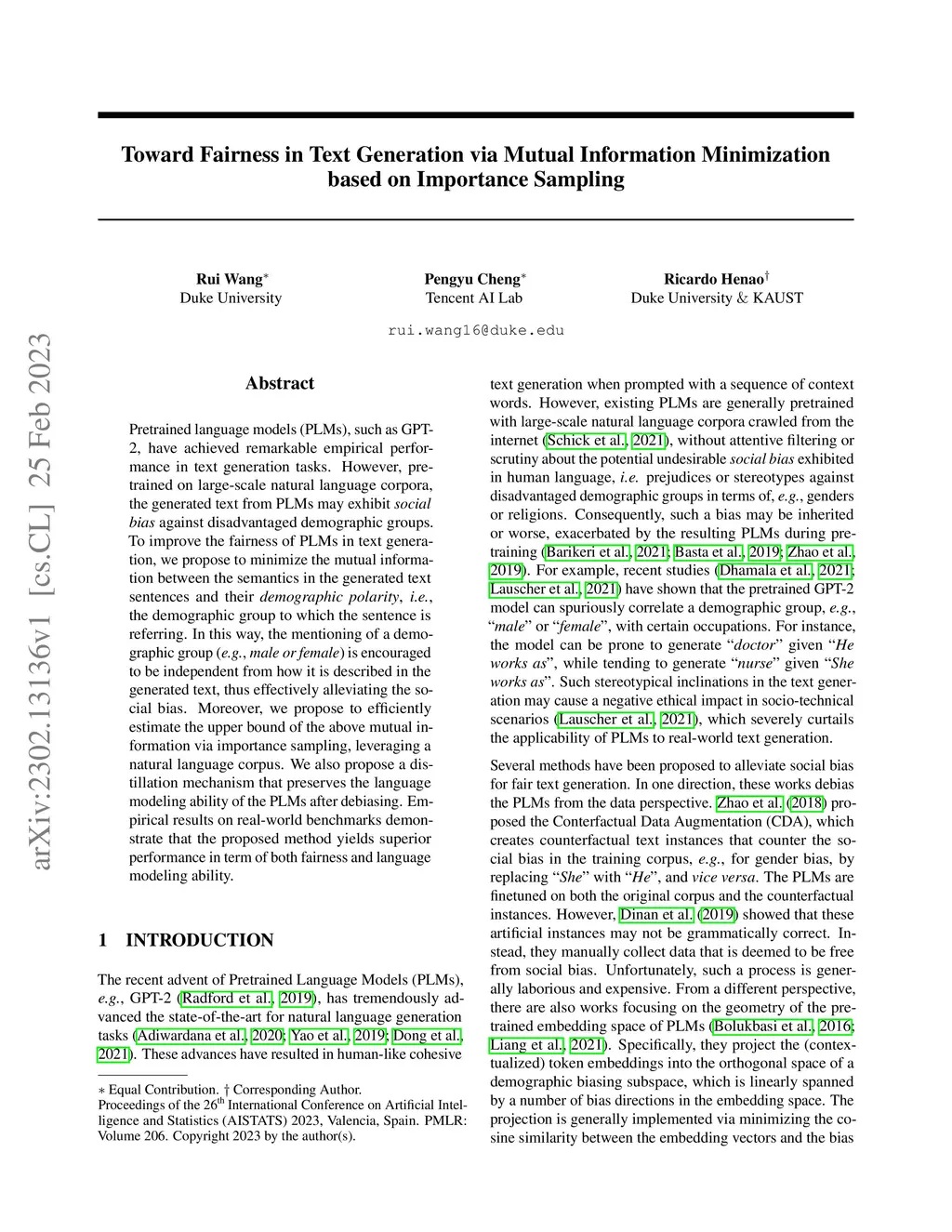 Pretrained language models (PLMs), such as GPT2, have achieved remarkable empirical performance in text generation tasks. However, pretrained on large-scale natural language corpora, the generated text from PLMs may exhibit social bias against disadvantaged demographic groups. To improve the fairness of PLMs in text generation, we propose to minimize the mutual information between the semantics in the generated text sentences and their demographic polarity, i.e., the demographic group to which the sentence is referring. In this way, the mentioning of a demographic group (e.g., male or female) is encouraged to be independent from how it is described in the generated text, thus effectively alleviating the social bias. Moreover, we propose to efficiently estimate the upper bound of the above mutual information via importance sampling, leveraging a natural language corpus. We also propose a distillation mechanism that preserves the language modeling ability of the PLMs after debiasing. Empirical results on real-world benchmarks demonstrate that the proposed method yields superior performance in term of both fairness and language modeling ability.