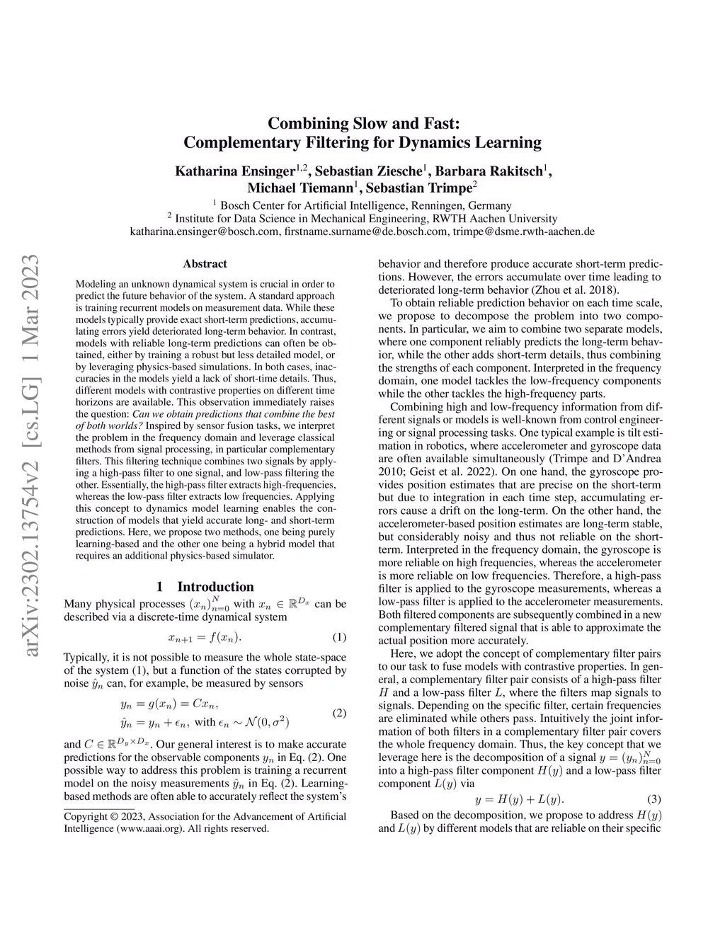Modeling an unknown dynamical system is crucial in order to predict the future behavior of the system. A standard approach is training recurrent models on measurement data. While these models typically provide exact short-term predictions, accumulating errors yield deteriorated long-term behavior. In contrast, models with reliable long-term predictions can often be obtained, either by training a robust but less detailed model, or by leveraging physics-based simulations. In both cases, inaccuracies in the models yield a lack of short-time details. Thus, different models with contrastive properties on different time horizons are available. This observation immediately raises the question: Can we obtain predictions that combine the best of both worlds? Inspired by sensor fusion tasks, we interpret the problem in the frequency domain and leverage classical methods from signal processing, in particular complementary filters. This filtering technique combines two signals by applying a high-pass filter to one signal, and low-pass filtering the other. Essentially, the high-pass filter extracts high-frequencies, whereas the low-pass filter extracts low frequencies. Applying this concept to dynamics model learning enables the construction of models that yield accurate long- and short-term predictions. Here, we propose two methods, one being purely learning-based and the other one being a hybrid model that requires an additional physics-based simulator.