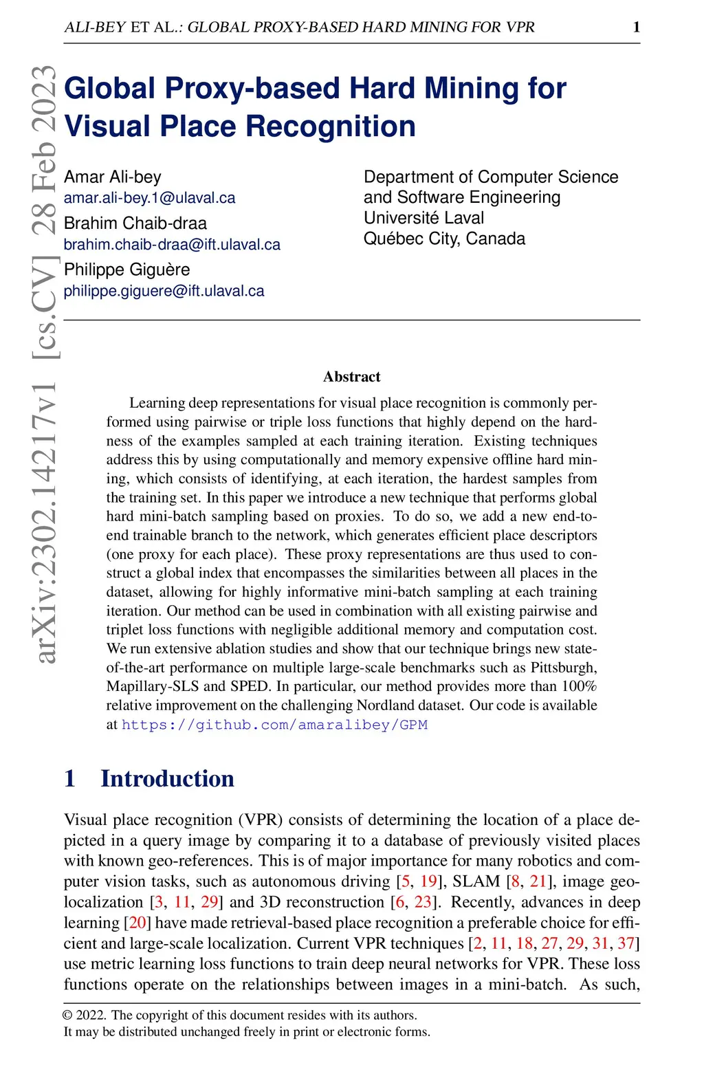 Learning deep representations for visual place recognition is commonly performed using pairwise or triple loss functions that highly depend on the hardness of the examples sampled at each training iteration. Existing techniques address this by using computationally and memory expensive offline hard mining, which consists of identifying, at each iteration, the hardest samples from the training set. In this paper we introduce a new technique that performs global hard mini-batch sampling based on proxies. To do so, we add a new end-to-end trainable branch to the network, which generates efficient place descriptors (one proxy for each place). These proxy representations are thus used to construct a global index that encompasses the similarities between all places in the dataset, allowing for highly informative mini-batch sampling at each training iteration. Our method can be used in combination with all existing pairwise and triplet loss functions with negligible additional memory and computation cost. We run extensive ablation studies and show that our technique brings new state-of-the-art performance on multiple large-scale benchmarks such as Pittsburgh, Mapillary-SLS and SPED. In particular, our method provides more than 100% relative improvement on the challenging Nordland dataset. Our code is available at https://github.com/amaralibey/GPM