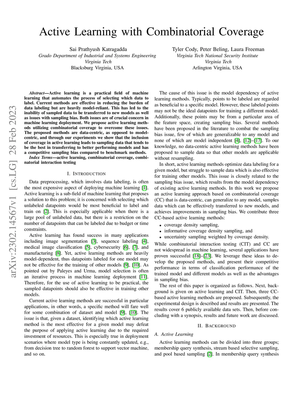 Active learning is a practical field of machine learning that automates the process of selecting which data to label. Current methods are effective in reducing the burden of data labeling but are heavily model-reliant. This has led to the inability of sampled data to be transferred to new models as well as issues with sampling bias. Both issues are of crucial concern in machine learning deployment. We propose active learning methods utilizing combinatorial coverage to overcome these issues. The proposed methods are data-centric, as opposed to model-centric, and through our experiments we show that the inclusion of coverage in active learning leads to sampling data that tends to be the best in transferring to better performing models and has a competitive sampling bias compared to benchmark methods.