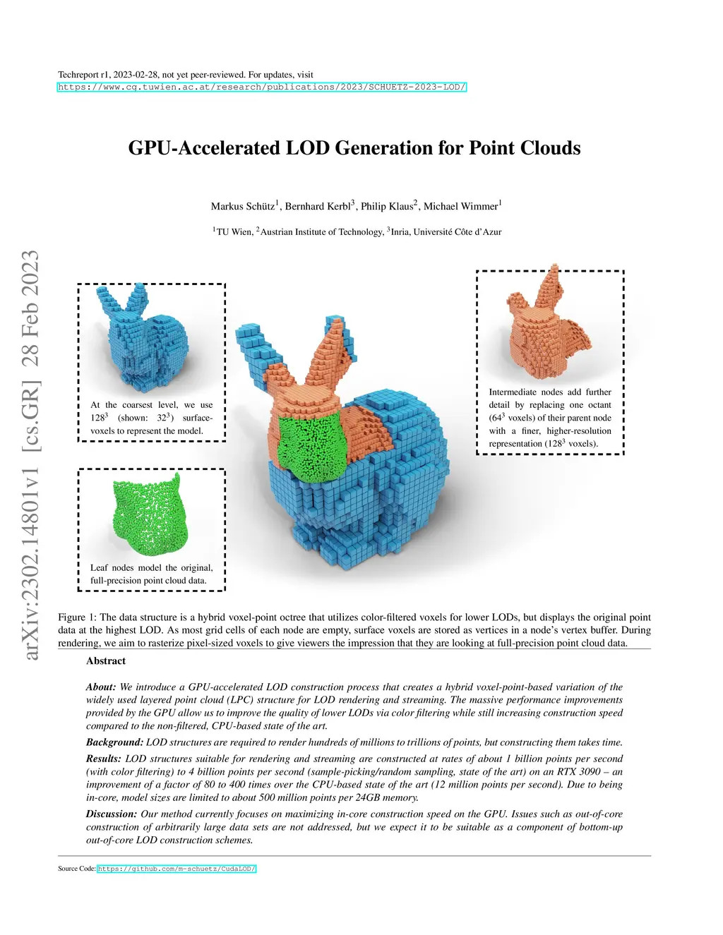About: We introduce a GPU-accelerated LOD construction process that creates a hybrid voxel-point-based variation of the widely used layered point cloud (LPC) structure for LOD rendering and streaming. The massive performance improvements provided by the GPU allow us to improve the quality of lower LODs via color filtering while still increasing construction speed compared to the non-filtered, CPU-based state of the art. Background: LOD structures are required to render hundreds of millions to trillions of points, but constructing them takes time. Results: LOD structures suitable for rendering and streaming are constructed at rates of about 1 billion points per second (with color filtering) to 4 billion points per second (sample-picking/random sampling, state of the art) on an RTX 3090 -- an improvement of a factor of 80 to 400 times over the CPU-based state of the art (12 million points per second). Due to being in-core, model sizes are limited to about 500 million points per 24GB memory. Discussion: Our method currently focuses on maximizing in-core construction speed on the GPU. Issues such as out-of-core construction of arbitrarily large data sets are not addressed, but we expect it to be suitable as a component of bottom-up out-of-core LOD construction schemes.