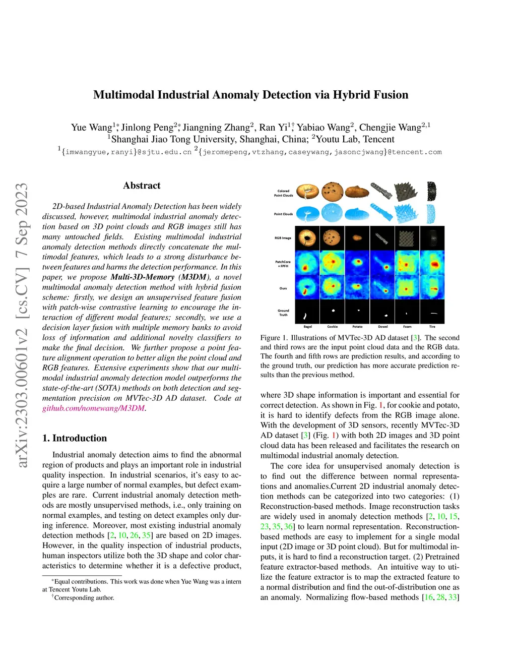 2D-based Industrial Anomaly Detection has been widely discussed, however, multimodal industrial anomaly detection based on 3D point clouds and RGB images still has many untouched fields. Existing multimodal industrial anomaly detection methods directly concatenate the multimodal features, which leads to a strong disturbance between features and harms the detection performance. In this paper, we propose Multi-3D-Memory (M3DM), a novel multimodal anomaly detection method with hybrid fusion scheme: firstly, we design an unsupervised feature fusion with patch-wise contrastive learning to encourage the interaction of different modal features; secondly, we use a decision layer fusion with multiple memory banks to avoid loss of information and additional novelty classifiers to make the final decision. We further propose a point feature alignment operation to better align the point cloud and RGB features. Extensive experiments show that our multimodal industrial anomaly detection model outperforms the state-of-the-art (SOTA) methods on both detection and segmentation precision on MVTec-3D AD dataset. Code is available at https://github.com/nomewang/M3DM.