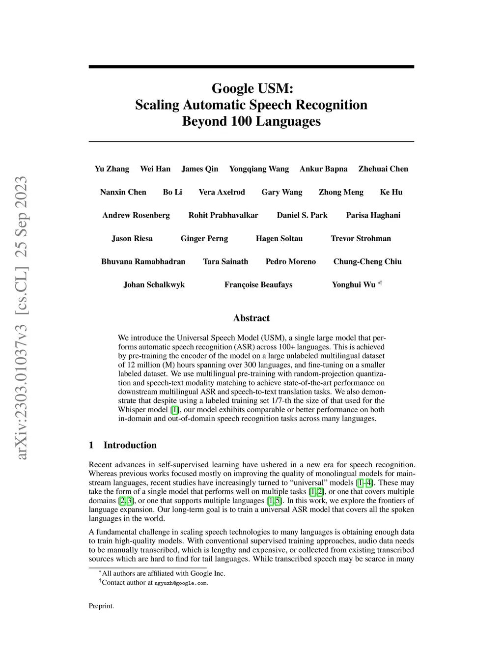 Google USM: Scaling Automatic Speech Recognition Beyond 100 Languages
