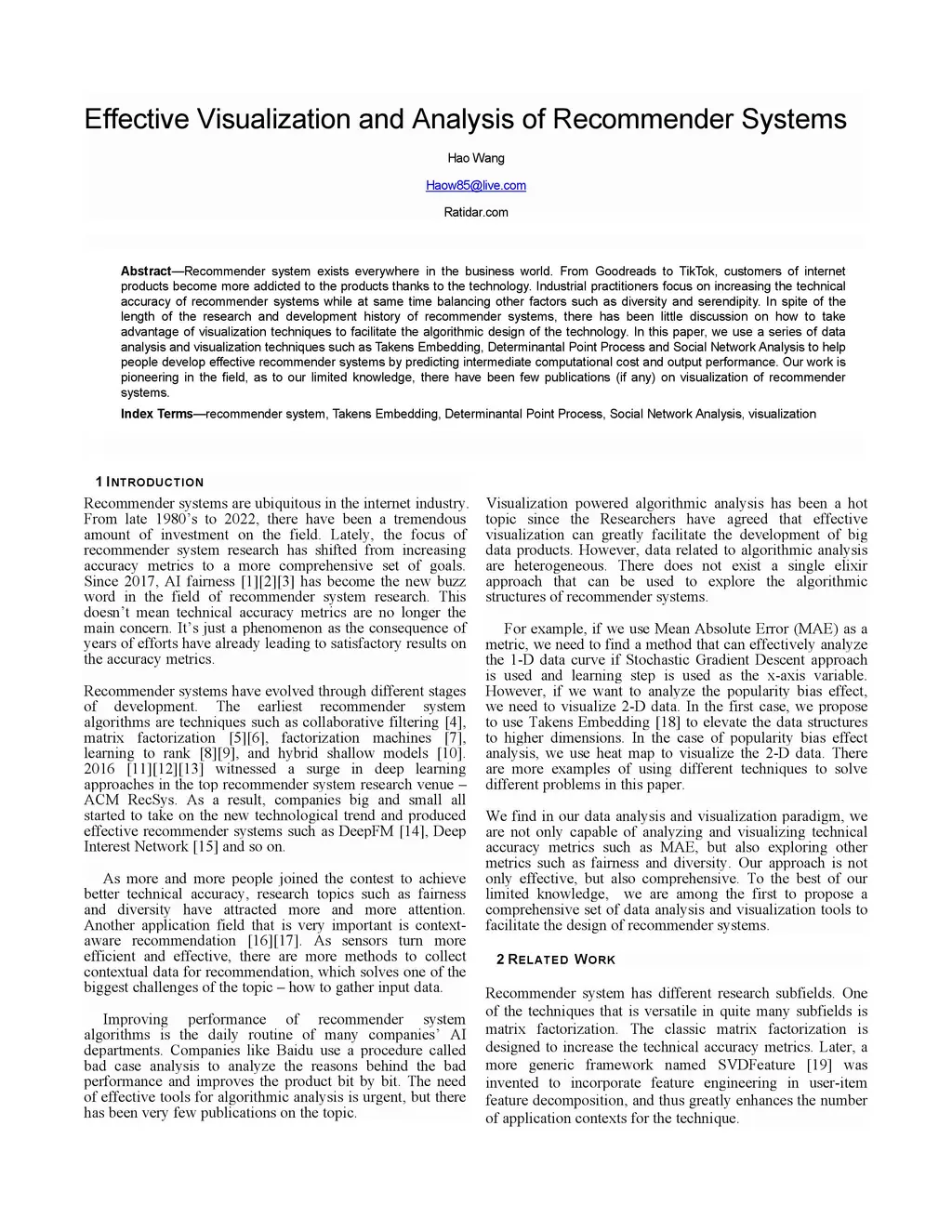 Recommender system exists everywhere in the business world. From Goodreads to TikTok, customers of internet products become more addicted to the products thanks to the technology. Industrial practitioners focus on increasing the technical accuracy of recommender systems while at same time balancing other factors such as diversity and serendipity. In spite of the length of the research and development history of recommender systems, there has been little discussion on how to take advantage of visualization techniques to facilitate the algorithmic design of the technology. In this paper, we use a series of data analysis and visualization techniques such as Takens Embedding, Determinantal Point Process and Social Network Analysis to help people develop effective recommender systems by predicting intermediate computational cost and output performance. Our work is pioneering in the field, as to our limited knowledge, there have been few publications (if any) on visualization of recommender systems.