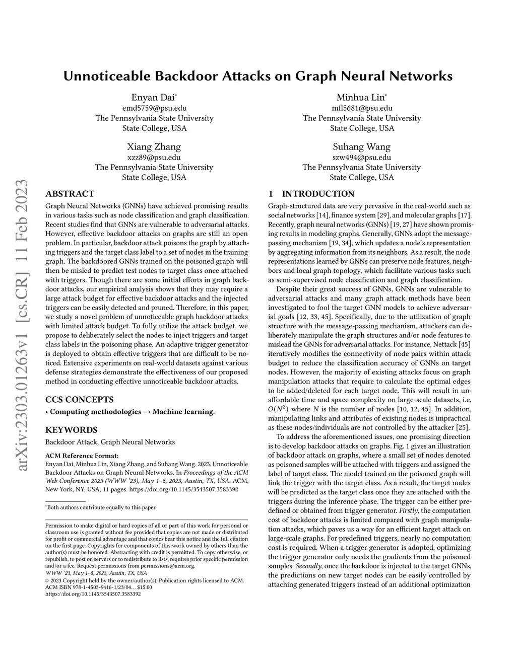 Unnoticeable Backdoor Attacks on Graph Neural Networks