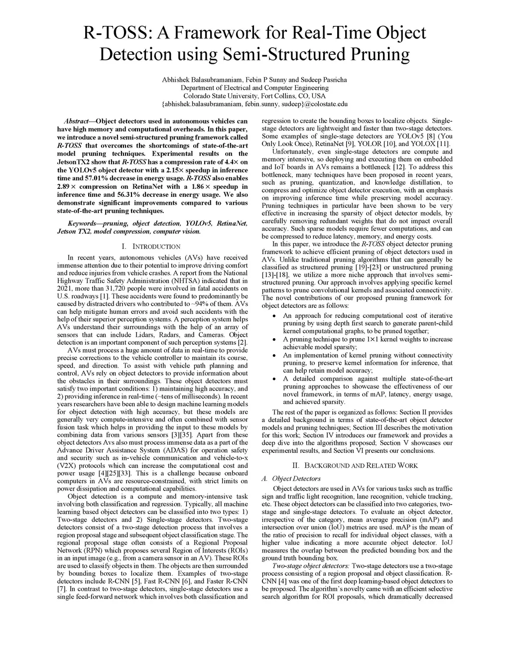 Object detectors used in autonomous vehicles can have high memory and computational overheads. In this paper, we introduce a novel semi-structured pruning framework called R-TOSS that overcomes the shortcomings of state-of-the-art model pruning techniques. Experimental results on the JetsonTX2 show that R-TOSS has a compression rate of 4.4x on the YOLOv5 object detector with a 2.15x speedup in inference time and 57.01% decrease in energy usage. R-TOSS also enables 2.89x compression on RetinaNet with a 1.86x speedup in inference time and 56.31% decrease in energy usage. We also demonstrate significant improvements compared to various state-of-the-art pruning techniques.
