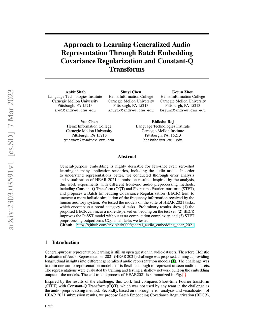 General-purpose embedding is highly desirable for few-shot even zero-shot learning in many application scenarios, including audio tasks. In order to understand representations better, we conducted a thorough error analysis and visualization of HEAR 2021 submission results. Inspired by the analysis, this work experiments with different front-end audio preprocessing methods, including Constant-Q Transform (CQT) and Short-time Fourier transform (STFT), and proposes a Batch Embedding Covariance Regularization (BECR) term to uncover a more holistic simulation of the frequency information received by the human auditory system. We tested the models on the suite of HEAR 2021 tasks, which encompass a broad category of tasks. Preliminary results show (1) the proposed BECR can incur a more dispersed embedding on the test set, (2) BECR improves the PaSST model without extra computation complexity, and (3) STFT preprocessing outperforms CQT in all tasks we tested. Github:https://github.com/ankitshah009/general_audio_embedding_hear_2021