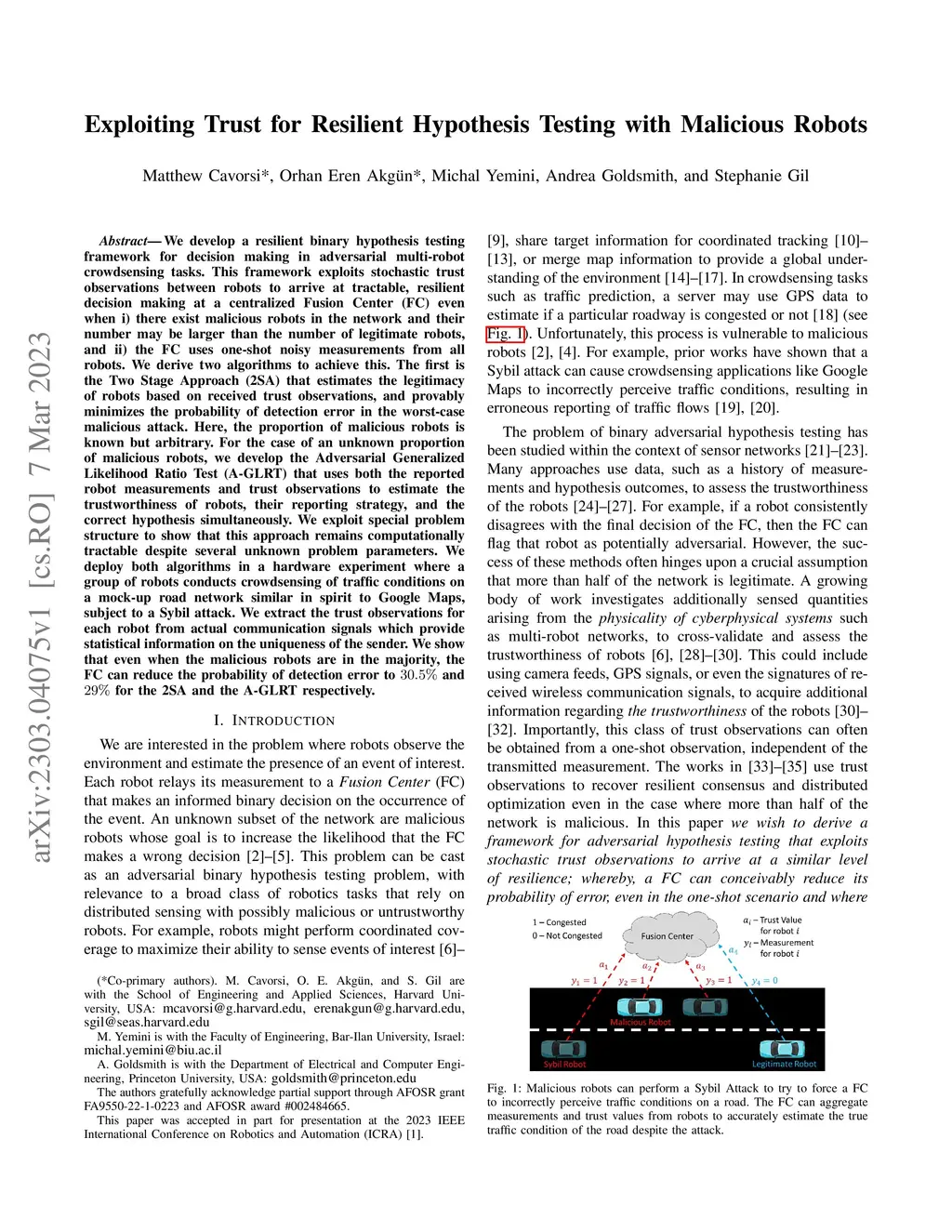 We develop a resilient binary hypothesis testing framework for decision making in adversarial multi-robot crowdsensing tasks. This framework exploits stochastic trust observations between robots to arrive at tractable, resilient decision making at a centralized Fusion Center (FC) even when i) there exist malicious robots in the network and their number may be larger than the number of legitimate robots, and ii) the FC uses one-shot noisy measurements from all robots. We derive two algorithms to achieve this. The first is the Two Stage Approach (2SA) that estimates the legitimacy of robots based on received trust observations, and provably minimizes the probability of detection error in the worst-case malicious attack. Here, the proportion of malicious robots is known but arbitrary. For the case of an unknown proportion of malicious robots, we develop the Adversarial Generalized Likelihood Ratio Test (A-GLRT) that uses both the reported robot measurements and trust observations to estimate the trustworthiness of robots, their reporting strategy, and the correct hypothesis simultaneously. We exploit special problem structure to show that this approach remains computationally tractable despite several unknown problem parameters. We deploy both algorithms in a hardware experiment where a group of robots conducts crowdsensing of traffic conditions on a mock-up road network similar in spirit to Google Maps, subject to a Sybil attack. We extract the trust observations for each robot from actual communication signals which provide statistical information on the uniqueness of the sender. We show that even when the malicious robots are in the majority, the FC can reduce the probability of detection error to 30.5% and 29% for the 2SA and the A-GLRT respectively.