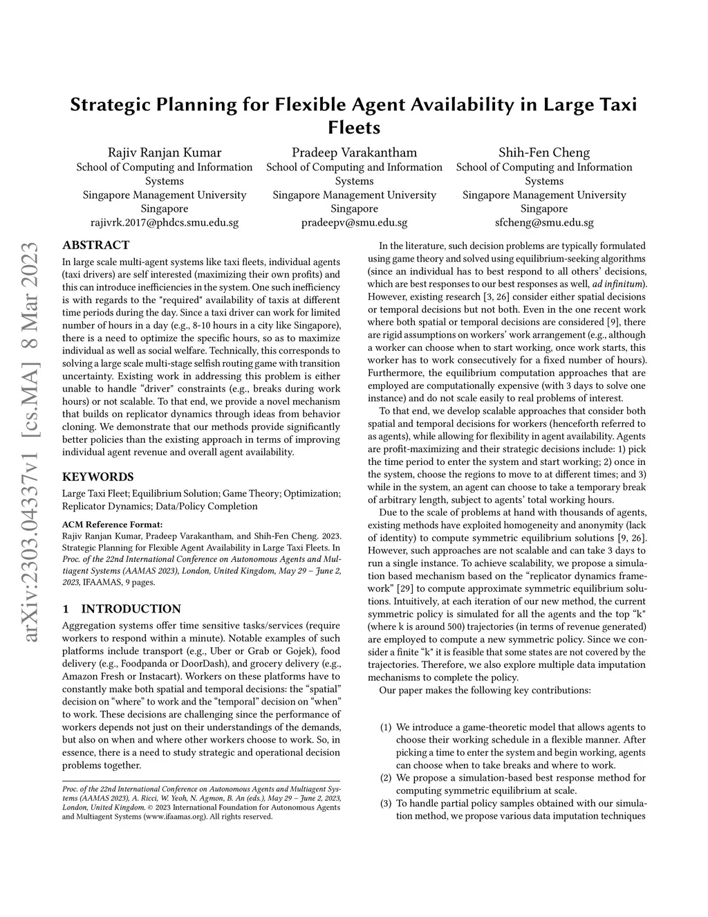 In large-scale multi-agent systems like taxi fleets, individual agents (taxi drivers) are self-interested (maximizing their own profits) and this can introduce inefficiencies in the system. One such inefficiency is with regard to the "required" availability of taxis at different time periods during the day. Since a taxi driver can work for a limited number of hours in a day (e.g., 8-10 hours in a city like Singapore), there is a need to optimize the specific hours, so as to maximize individual as well as social welfare. Technically, this corresponds to solving a large-scale multi-stage selfish routing game with transition uncertainty. Existing work in addressing this problem is either unable to handle ``driver" constraints (e.g., breaks during work hours) or not scalable. To that end, we provide a novel mechanism that builds on replicator dynamics through ideas from behavior cloning. We demonstrate that our methods provide significantly better policies than the existing approach in terms of improving individual agent revenue and overall agent availability.