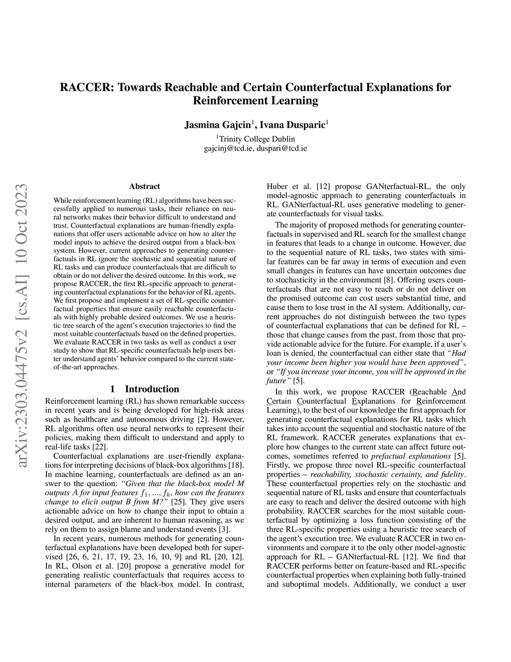While reinforcement learning (RL) algorithms have been successfully applied to numerous tasks, their reliance on neural networks makes their behavior difficult to understand and trust. Counterfactual explanations are human-friendly explanations that offer users actionable advice on how to alter the model inputs to achieve the desired output from a black-box system. However, current approaches to generating counterfactuals in RL ignore the stochastic and sequential nature of RL tasks and can produce counterfactuals that are difficult to obtain or do not deliver the desired outcome. In this work, we propose RACCER, the first RL-specific approach to generating counterfactual explanations for the behavior of RL agents. We first propose and implement a set of RL-specific counterfactual properties that ensure easily reachable counterfactuals with highly probable desired outcomes. We use a heuristic tree search of the agent's execution trajectories to find the most suitable counterfactuals based on the defined properties. We evaluate RACCER in two tasks as well as conduct a user study to show that RL-specific counterfactuals help users better understand agents' behavior compared to the current state-of-the-art approaches.