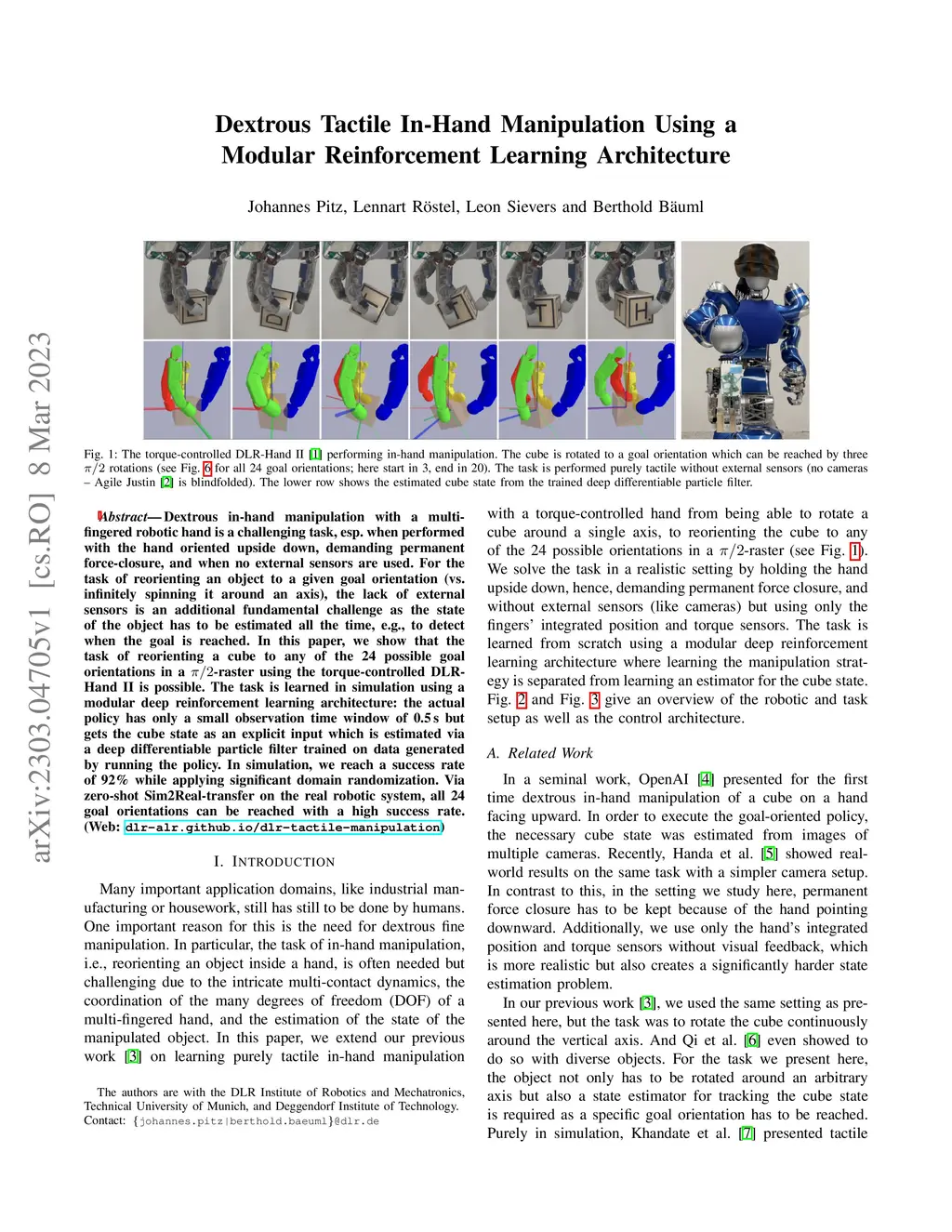 Dextrous in-hand manipulation with a multi-fingered robotic hand is a challenging task, esp. when performed with the hand oriented upside down, demanding permanent force-closure, and when no external sensors are used. For the task of reorienting an object to a given goal orientation (vs. infinitely spinning it around an axis), the lack of external sensors is an additional fundamental challenge as the state of the object has to be estimated all the time, e.g., to detect when the goal is reached. In this paper, we show that the task of reorienting a cube to any of the 24 possible goal orientations in a /2-raster using the torque-controlled DLR-Hand II is possible. The task is learned in simulation using a modular deep reinforcement learning architecture: the actual policy has only a small observation time window of 0.5s but gets the cube state as an explicit input which is estimated via a deep differentiable particle filter trained on data generated by running the policy. In simulation, we reach a success rate of 92% while applying significant domain randomization. Via zero-shot Sim2Real-transfer on the real robotic system, all 24 goal orientations can be reached with a high success rate.