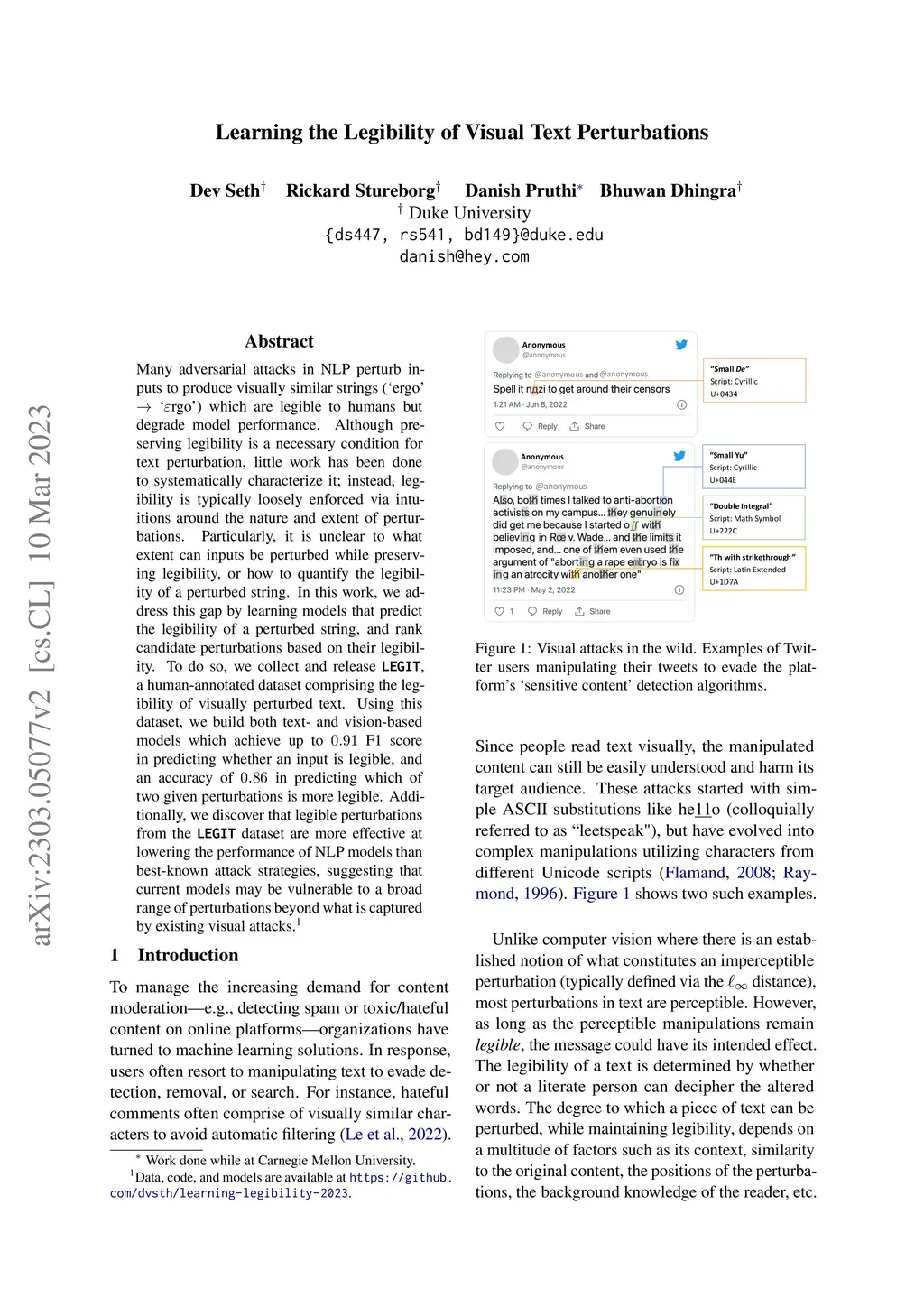Many adversarial attacks in NLP perturb inputs to produce visually similar strings (érgo' 'rgo') which are legible to humans but degrade model performance. Although preserving legibility is a necessary condition for text perturbation, little work has been done to systematically characterize it; instead, legibility is typically loosely enforced via intuitions around the nature and extent of perturbations. Particularly, it is unclear to what extent can inputs be perturbed while preserving legibility, or how to quantify the legibility of a perturbed string. In this work, we address this gap by learning models that predict the legibility of a perturbed string, and rank candidate perturbations based on their legibility. To do so, we collect and release LEGIT, a human-annotated dataset comprising the legibility of visually perturbed text. Using this dataset, we build both text- and vision-based models which achieve up to F1 score in predicting whether an input is legible, and an accuracy of in predicting which of two given perturbations is more legible. Additionally, we discover that legible perturbations from the LEGIT dataset are more effective at lowering the performance of NLP models than best-known attack strategies, suggesting that current models may be vulnerable to a broad range of perturbations beyond what is captured by existing visual attacks. Data, code, and models are available at https://github.com/dvsth/learning-legibility-2023.