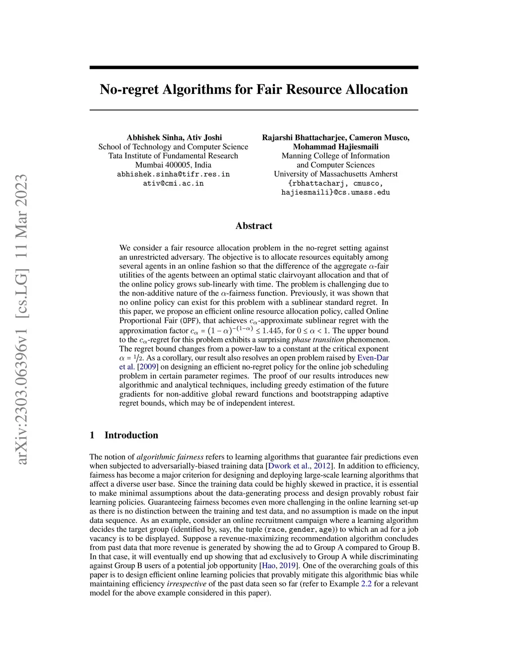 We consider a fair resource allocation problem in the no-regret setting against an unrestricted adversary. The objective is to allocate resources equitably among several agents in an online fashion so that the difference of the aggregate -fair utilities of the agents between an optimal static clairvoyant allocation and that of the online policy grows sub-linearly with time. The problem is challenging due to the non-additive nature of the -fairness function. Previously, it was shown that no online policy can exist for this problem with a sublinear standard regret. In this paper, we propose an efficient online resource allocation policy, called Online Proportional Fair (OPF), that achieves -approximate sublinear regret with the approximation factor for . The upper bound to the -regret for this problem exhibits a surprising phase transition phenomenon. The regret bound changes from a power-law to a constant at the critical exponent As a corollary, our result also resolves an open problem raised by Even-Dar et al. [2009] on designing an efficient no-regret policy for the online job scheduling problem in certain parameter regimes. The proof of our results introduces new algorithmic and analytical techniques, including greedy estimation of the future gradients for non-additive global reward functions and bootstrapping adaptive regret bounds, which may be of independent interest.