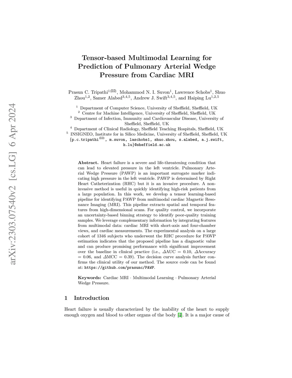 Heart failure is a serious and life-threatening condition that can lead to elevated pressure in the left ventricle. Pulmonary Arterial Wedge Pressure (PAWP) is an important surrogate marker indicating high pressure in the left ventricle. PAWP is determined by Right Heart Catheterization (RHC) but it is an invasive procedure. A non-invasive method is useful in quickly identifying high-risk patients from a large population. In this work, we develop a tensor learning-based pipeline for identifying PAWP from multimodal cardiac Magnetic Resonance Imaging (MRI). This pipeline extracts spatial and temporal features from high-dimensional scans. For quality control, we incorporate an epistemic uncertainty-based binning strategy to identify poor-quality training samples. To improve the performance, we learn complementary information by integrating features from multimodal data: cardiac MRI with short-axis and four-chamber views, and Electronic Health Records. The experimental analysis on a large cohort of subjects who underwent the RHC procedure for PAWP estimation indicates that the proposed pipeline has a diagnostic value and can produce promising performance with significant improvement over the baseline in clinical practice (i.e., AUC , Accuracy , and MCC ). The decision curve analysis further confirms the clinical utility of our method.