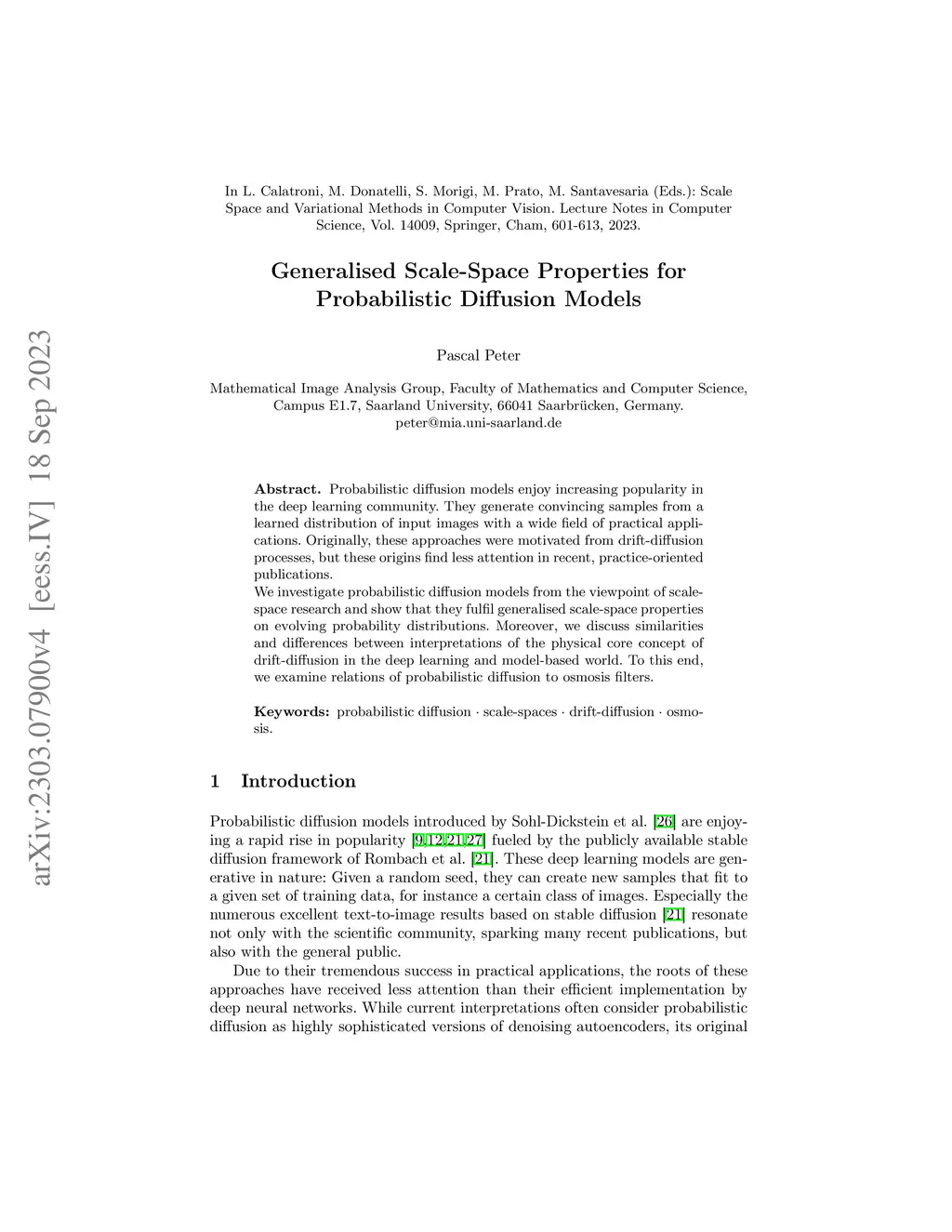Probabilistic diffusion models enjoy increasing popularity in the deep learning community. They generate convincing samples from a learned distribution of input images with a wide field of practical applications. Originally, these approaches were motivated from drift-diffusion processes, but these origins find less attention in recent, practice-oriented publications. We investigate probabilistic diffusion models from the viewpoint of scale-space research and show that they fulfil generalised scale-space properties on evolving probability distributions. Moreover, we discuss similarities and differences between interpretations of the physical core concept of drift-diffusion in the deep learning and model-based world. To this end, we examine relations of probabilistic diffusion to osmosis filters.