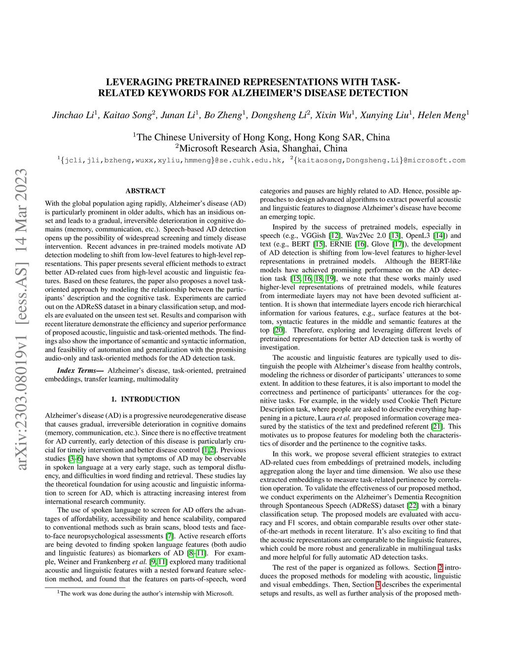 With the global population aging rapidly, Alzheimer's disease (AD) is particularly prominent in older adults, which has an insidious onset and leads to a gradual, irreversible deterioration in cognitive domains (memory, communication, etc.). Speech-based AD detection opens up the possibility of widespread screening and timely disease intervention. Recent advances in pre-trained models motivate AD detection modeling to shift from low-level features to high-level representations. This paper presents several efficient methods to extract better AD-related cues from high-level acoustic and linguistic features. Based on these features, the paper also proposes a novel task-oriented approach by modeling the relationship between the participants' description and the cognitive task. Experiments are carried out on the ADReSS dataset in a binary classification setup, and models are evaluated on the unseen test set. Results and comparison with recent literature demonstrate the efficiency and superior performance of proposed acoustic, linguistic and task-oriented methods. The findings also show the importance of semantic and syntactic information, and feasibility of automation and generalization with the promising audio-only and task-oriented methods for the AD detection task.