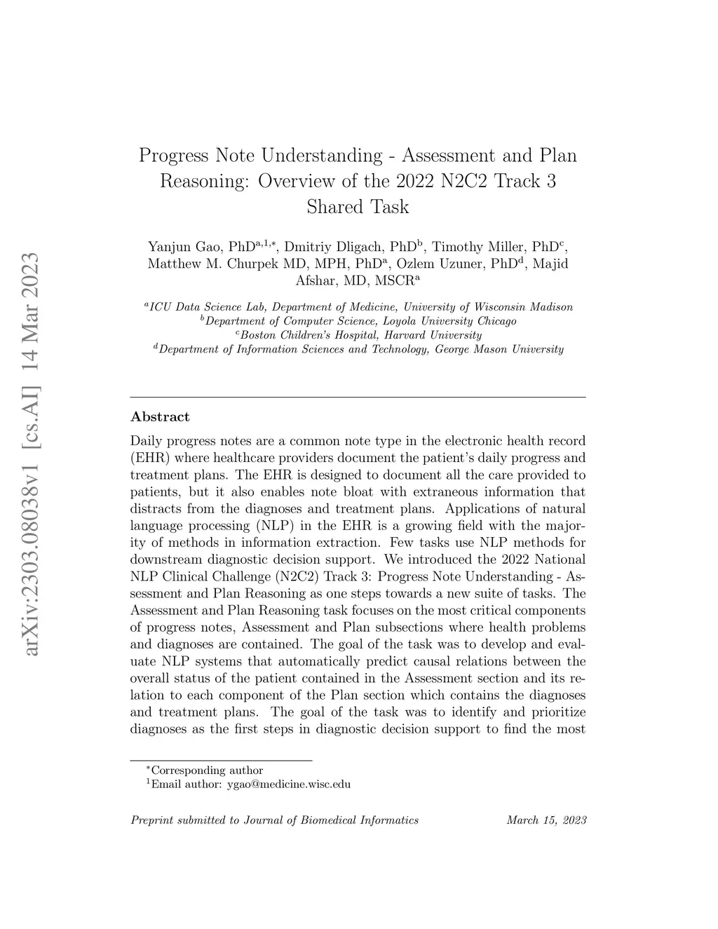 Daily progress notes are common types in the electronic health record (EHR) where healthcare providers document the patient's daily progress and treatment plans. The EHR is designed to document all the care provided to patients, but it also enables note bloat with extraneous information that distracts from the diagnoses and treatment plans. Applications of natural language processing (NLP) in the EHR is a growing field with the majority of methods in information extraction. Few tasks use NLP methods for downstream diagnostic decision support. We introduced the 2022 National NLP Clinical Challenge (N2C2) Track 3: Progress Note Understanding - Assessment and Plan Reasoning as one step towards a new suite of tasks. The Assessment and Plan Reasoning task focuses on the most critical components of progress notes, Assessment and Plan subsections where health problems and diagnoses are contained. The goal of the task was to develop and evaluate NLP systems that automatically predict causal relations between the overall status of the patient contained in the Assessment section and its relation to each component of the Plan section which contains the diagnoses and treatment plans. The goal of the task was to identify and prioritize diagnoses as the first steps in diagnostic decision support to find the most relevant information in long documents like daily progress notes. We present the results of 2022 n2c2 Track 3 and provide a description of the data, evaluation, participation and system performance.
