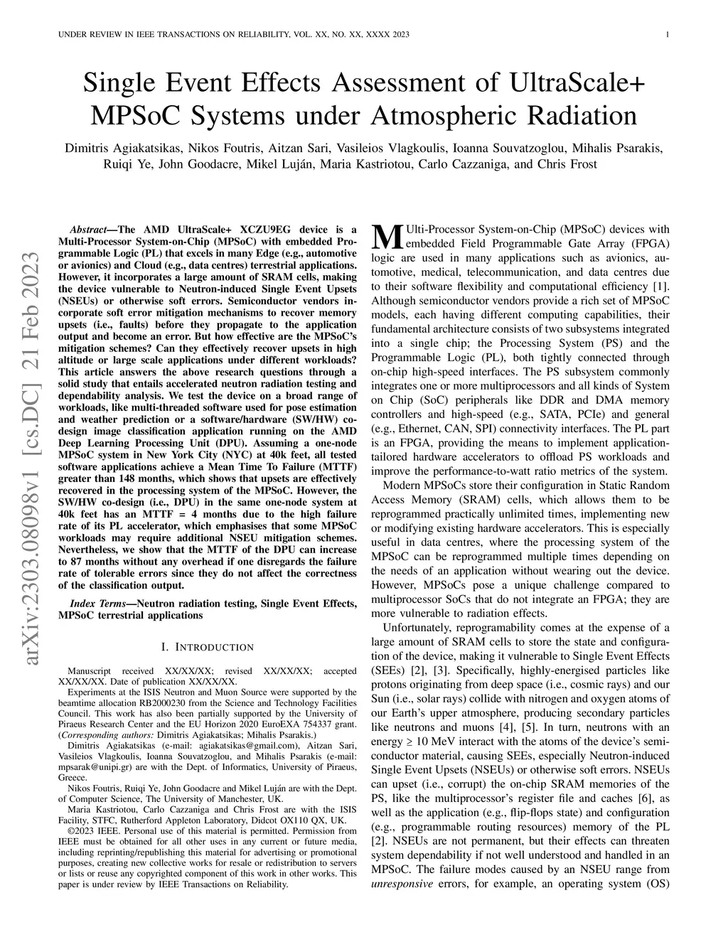 The AMD UltraScale+ XCZU9EG device is a Multi-Processor System-on-Chip (MPSoC) with embedded Programmable Logic (PL) that excels in many Edge (e.g., automotive or avionics) and Cloud (e.g., data centres) terrestrial applications. However, it incorporates a large amount of SRAM cells, making the device vulnerable to Neutron-induced Single Event Upsets (NSEUs) or otherwise soft errors. Semiconductor vendors incorporate soft error mitigation mechanisms to recover memory upsets (i.e., faults) before they propagate to the application output and become an error. But how effective are the MPSoC's mitigation schemes? Can they effectively recover upsets in high altitude or large scale applications under different workloads? This article answers the above research questions through a solid study that entails accelerated neutron radiation testing and dependability analysis. We test the device on a broad range of workloads, like multi-threaded software used for pose estimation and weather prediction or a software/hardware (SW/HW) co-design image classification application running on the AMD Deep Learning Processing Unit (DPU). Assuming a one-node MPSoC system in New York City (NYC) at 40k feet, all tested software applications achieve a Mean Time To Failure (MTTF) greater than 148 months, which shows that upsets are effectively recovered in the processing system of the MPSoC. However, the SW/HW co-design (i.e., DPU) in the same one-node system at 40k feet has an MTTF = 4 months due to the high failure rate of its PL accelerator, which emphasises that some MPSoC workloads may require additional NSEU mitigation schemes. Nevertheless, we show that the MTTF of the DPU can increase to 87 months without any overhead if one disregards the failure rate of tolerable errors since they do not affect the correctness of the classification output.