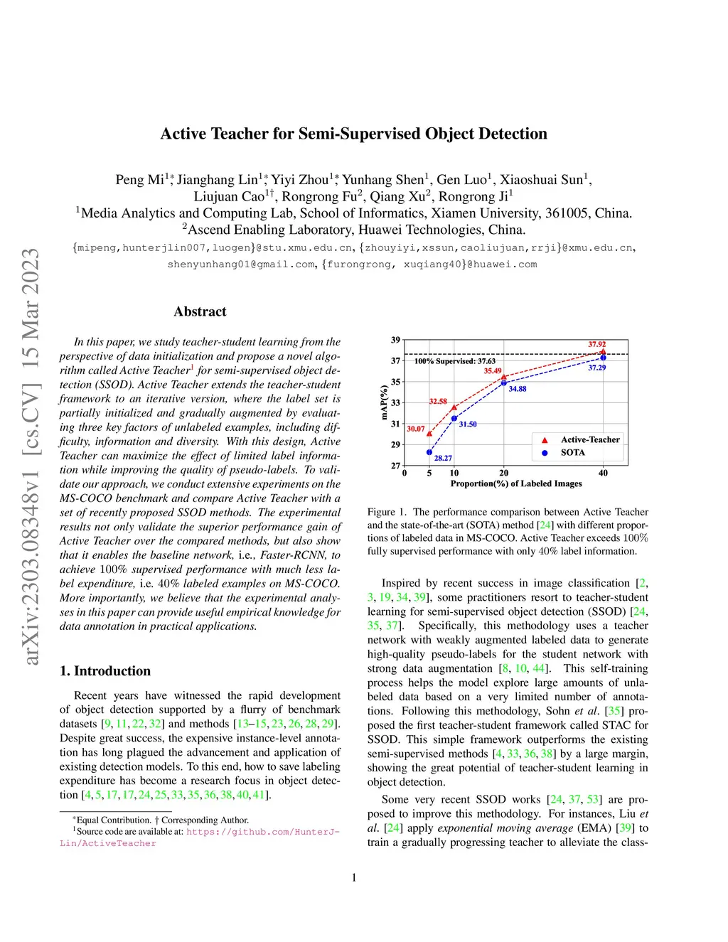 In this paper, we study teacher-student learning from the perspective of data initialization and propose a novel algorithm called Active Teacher(Source code are available at: \url{https://github.com/HunterJ-Lin/ActiveTeacher}) for semi-supervised object detection (SSOD). Active Teacher extends the teacher-student framework to an iterative version, where the label set is partially initialized and gradually augmented by evaluating three key factors of unlabeled examples, including difficulty, information and diversity. With this design, Active Teacher can maximize the effect of limited label information while improving the quality of pseudo-labels. To validate our approach, we conduct extensive experiments on the MS-COCO benchmark and compare Active Teacher with a set of recently proposed SSOD methods. The experimental results not only validate the superior performance gain of Active Teacher over the compared methods, but also show that it enables the baseline network, ie, Faster-RCNN, to achieve 100% supervised performance with much less label expenditure, ie 40% labeled examples on MS-COCO. More importantly, we believe that the experimental analyses in this paper can provide useful empirical knowledge for data annotation in practical applications.