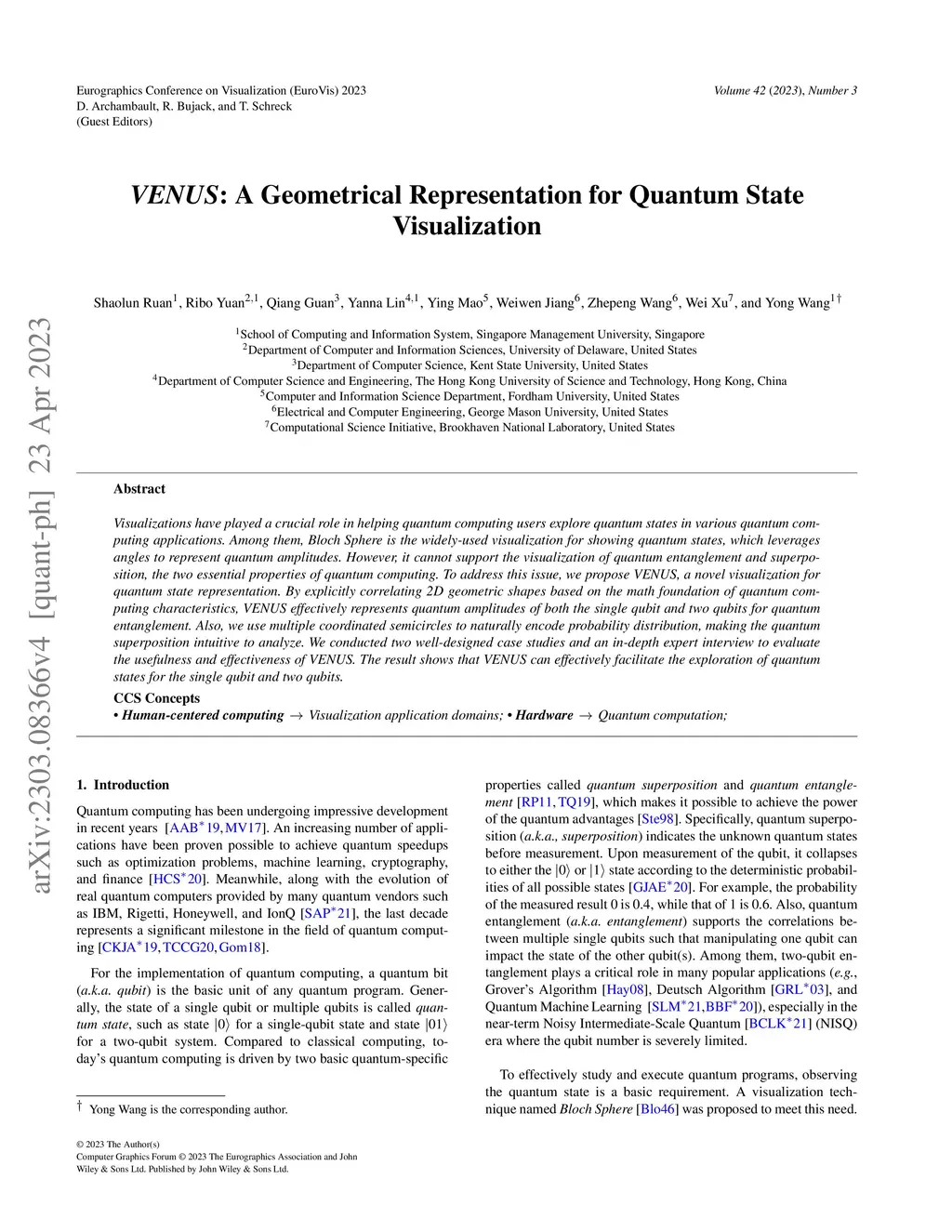 Visualizations have played a crucial role in helping quantum computing users explore quantum states in various quantum computing applications. Among them, Bloch Sphere is the widely-used visualization for showing quantum states, which leverages angles to represent quantum amplitudes. However, it cannot support the visualization of quantum entanglement and superposition, the two essential properties of quantum computing. To address this issue, we propose VENUS, a novel visualization for quantum state representation. By explicitly correlating 2D geometric shapes based on the math foundation of quantum computing characteristics, VENUS effectively represents quantum amplitudes of both the single qubit and two qubits for quantum entanglement. Also, we use multiple coordinated semicircles to naturally encode probability distribution, making the quantum superposition intuitive to analyze. We conducted two well-designed case studies and an in-depth expert interview to evaluate the usefulness and effectiveness of VENUS. The result shows that VENUS can effectively facilitate the exploration of quantum states for the single qubit and two qubits.