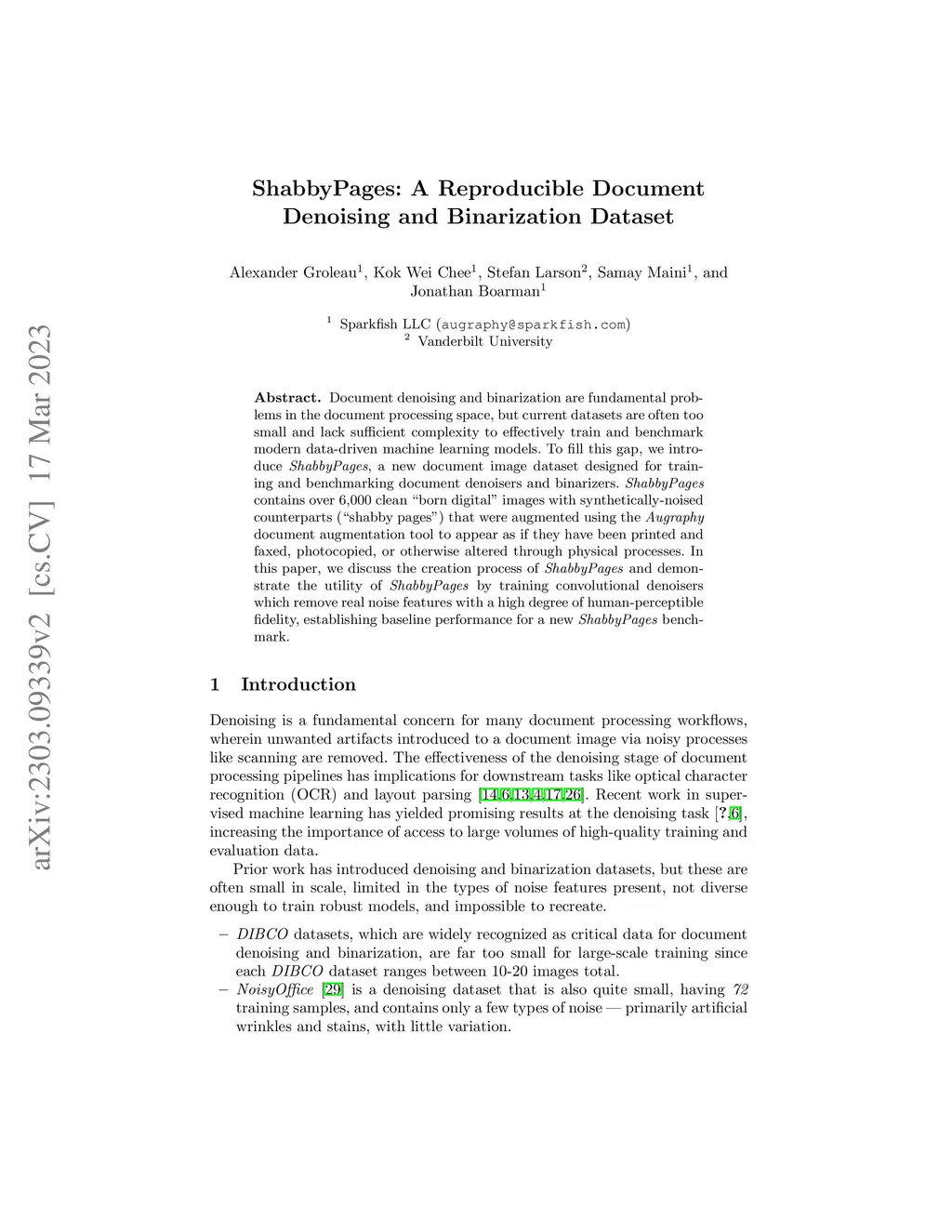 Document denoising and binarization are fundamental problems in the document processing space, but current datasets are often too small and lack sufficient complexity to effectively train and benchmark modern data-driven machine learning models. To fill this gap, we introduce ShabbyPages, a new document image dataset designed for training and benchmarking document denoisers and binarizers. ShabbyPages contains over 6,000 clean "born digital" images with synthetically-noised counterparts ("shabby pages") that were augmented using the Augraphy document augmentation tool to appear as if they have been printed and faxed, photocopied, or otherwise altered through physical processes. In this paper, we discuss the creation process of ShabbyPages and demonstrate the utility of ShabbyPages by training convolutional denoisers which remove real noise features with a high degree of human-perceptible fidelity, establishing baseline performance for a new ShabbyPages benchmark.