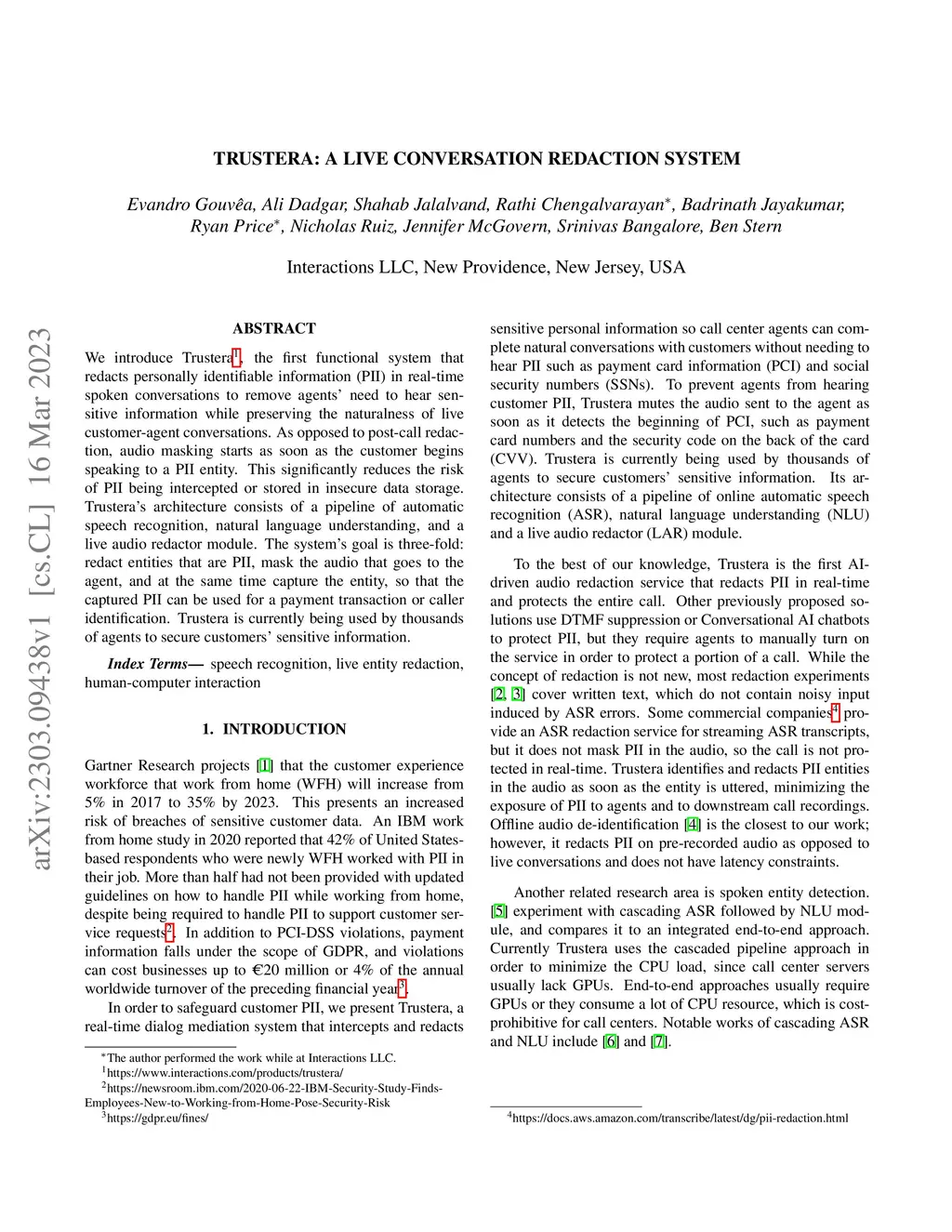 Trustera, the first functional system that redacts personally identifiable information (PII) in real-time spoken conversations to remove agents' need to hear sensitive information while preserving the naturalness of live customer-agent conversations. As opposed to post-call redaction, audio masking starts as soon as the customer begins speaking to a PII entity. This significantly reduces the risk of PII being intercepted or stored in insecure data storage. Trustera's architecture consists of a pipeline of automatic speech recognition, natural language understanding, and a live audio redactor module. The system's goal is three-fold: redact entities that are PII, mask the audio that goes to the agent, and at the same time capture the entity, so that the captured PII can be used for a payment transaction or caller identification. Trustera is currently being used by thousands of agents to secure customers' sensitive information.