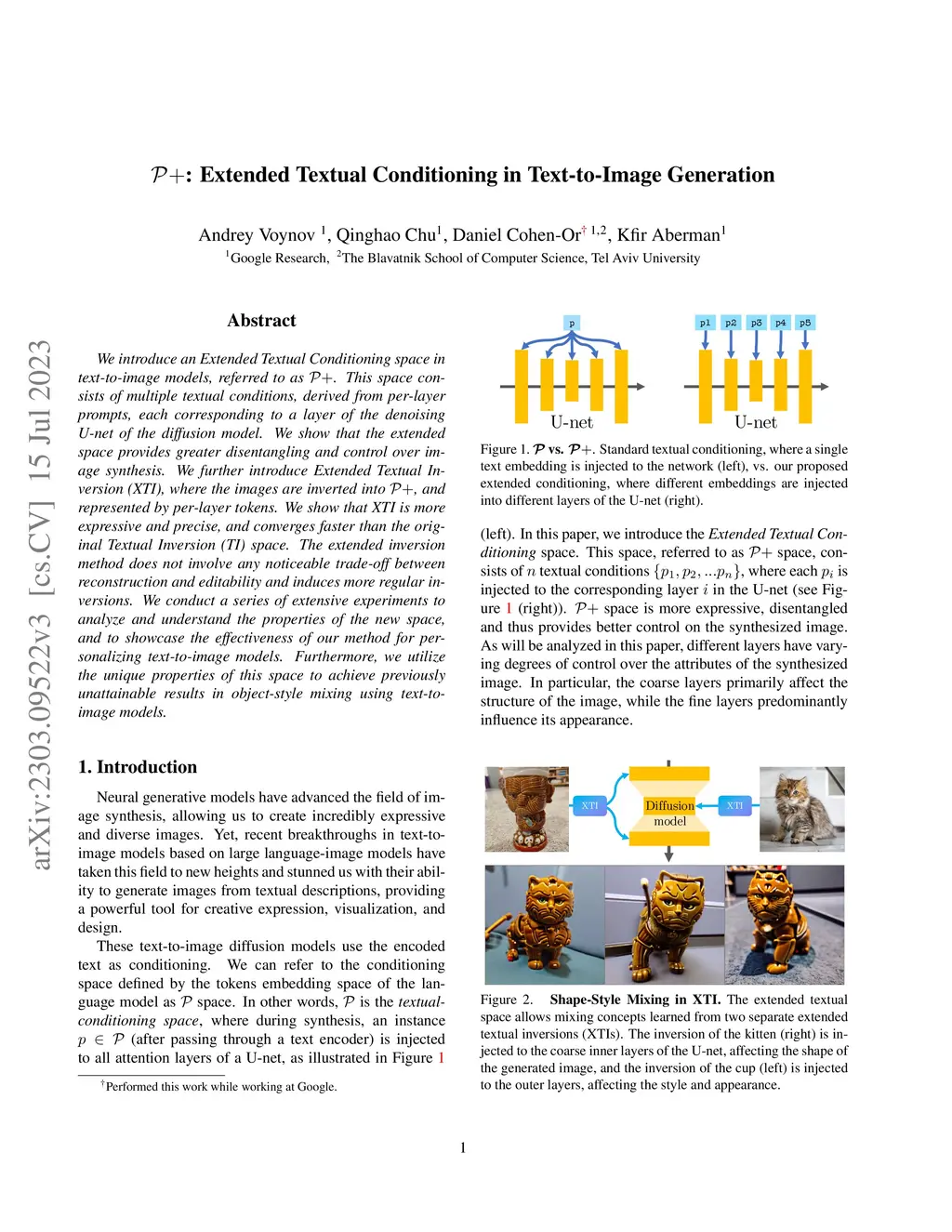 We introduce an Extended Textual Conditioning space in text-to-image models, referred to as . This space consists of multiple textual conditions, derived from per-layer prompts, each corresponding to a layer of the denoising U-net of the diffusion model. We show that the extended space provides greater disentangling and control over image synthesis. We further introduce Extended Textual Inversion (XTI), where the images are inverted into , and represented by per-layer tokens. We show that XTI is more expressive and precise, and converges faster than the original Textual Inversion (TI) space. The extended inversion method does not involve any noticeable trade-off between reconstruction and editability and induces more regular inversions. We conduct a series of extensive experiments to analyze and understand the properties of the new space, and to showcase the effectiveness of our method for personalizing text-to-image models. Furthermore, we utilize the unique properties of this space to achieve previously unattainable results in object-style mixing using text-to-image models. Project page: https://prompt-plus.github.io