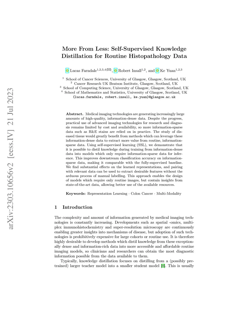 Medical imaging technologies are generating increasingly large amounts of high-quality, information-dense data. Despite the progress, practical use of advanced imaging technologies for research and diagnosis remains limited by cost and availability, so information-sparse data such as H&E stains are relied on in practice. The study of diseased tissue requires methods which can leverage these information-dense data to extract more value from routine, information-sparse data. Using self-supervised deep learning, we demonstrate that it is possible to distil knowledge during training from information-dense data into models which only require information-sparse data for inference. This improves downstream classification accuracy on information-sparse data, making it comparable with the fully-supervised baseline. We find substantial effects on the learned representations, and this training process identifies subtle features which otherwise go undetected. This approach enables the design of models which require only routine images, but contain insights from state-of-the-art data, allowing better use of the available resources.
