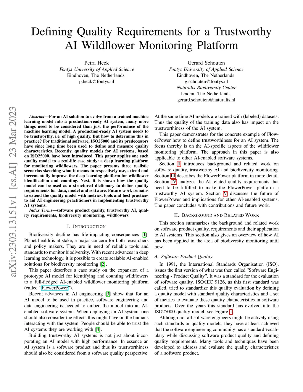 For an AI solution to evolve from a trained machine learning model into a production-ready AI system, many more things need to be considered than just the performance of the machine learning model. A production-ready AI system needs to be trustworthy, i.e. of high quality. But how to determine this in practice? For traditional software, ISO25000 and its predecessors have since long time been used to define and measure quality characteristics. Recently, quality models for AI systems, based on ISO25000, have been introduced. This paper applies one such quality model to a real-life case study: a deep learning platform for monitoring wildflowers. The paper presents three realistic scenarios sketching what it means to respectively use, extend and incrementally improve the deep learning platform for wildflower identification and counting. Next, it is shown how the quality model can be used as a structured dictionary to define quality requirements for data, model and software. Future work remains to extend the quality model with metrics, tools and best practices to aid AI engineering practitioners in implementing trustworthy AI systems.