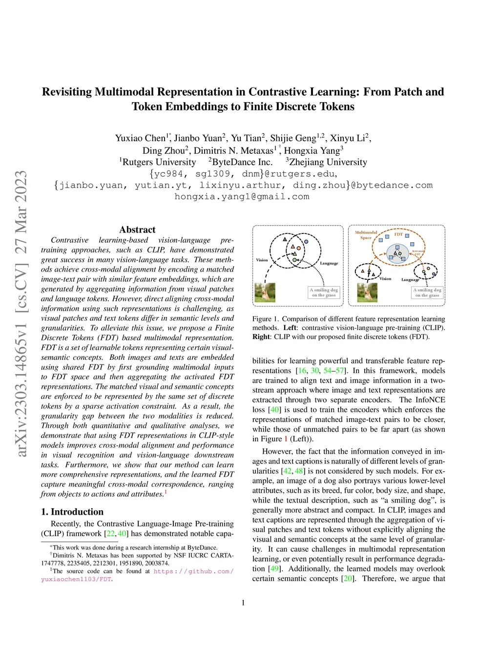 Contrastive learning-based vision-language pre-training approaches, such as CLIP, have demonstrated great success in many vision-language tasks. These methods achieve cross-modal alignment by encoding a matched image-text pair with similar feature embeddings, which are generated by aggregating information from visual patches and language tokens. However, direct aligning cross-modal information using such representations is challenging, as visual patches and text tokens differ in semantic levels and granularities. To alleviate this issue, we propose a Finite Discrete Tokens (FDT) based multimodal representation. FDT is a set of learnable tokens representing certain visual-semantic concepts. Both images and texts are embedded using shared FDT by first grounding multimodal inputs to FDT space and then aggregating the activated FDT representations. The matched visual and semantic concepts are enforced to be represented by the same set of discrete tokens by a sparse activation constraint. As a result, the granularity gap between the two modalities is reduced. Through both quantitative and qualitative analyses, we demonstrate that using FDT representations in CLIP-style models improves cross-modal alignment and performance in visual recognition and vision-language downstream tasks. Furthermore, we show that our method can learn more comprehensive representations, and the learned FDT capture meaningful cross-modal correspondence, ranging from objects to actions and attributes.