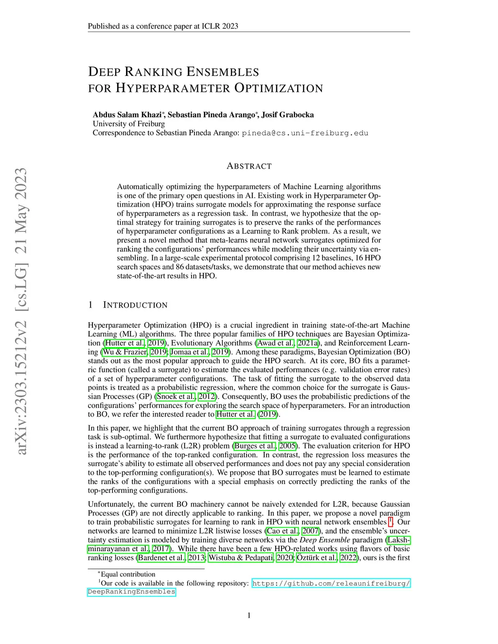 Automatically optimizing the hyperparameters of Machine Learning algorithms is one of the primary open questions in AI. Existing work in Hyperparameter Optimization (HPO) trains surrogate models for approximating the response surface of hyperparameters as a regression task. In contrast, we hypothesize that the optimal strategy for training surrogates is to preserve the ranks of the performances of hyperparameter configurations as a Learning to Rank problem. As a result, we present a novel method that meta-learns neural network surrogates optimized for ranking the configurations' performances while modeling their uncertainty via ensembling. In a large-scale experimental protocol comprising 12 baselines, 16 HPO search spaces and 86 datasets/tasks, we demonstrate that our method achieves new state-of-the-art results in HPO.