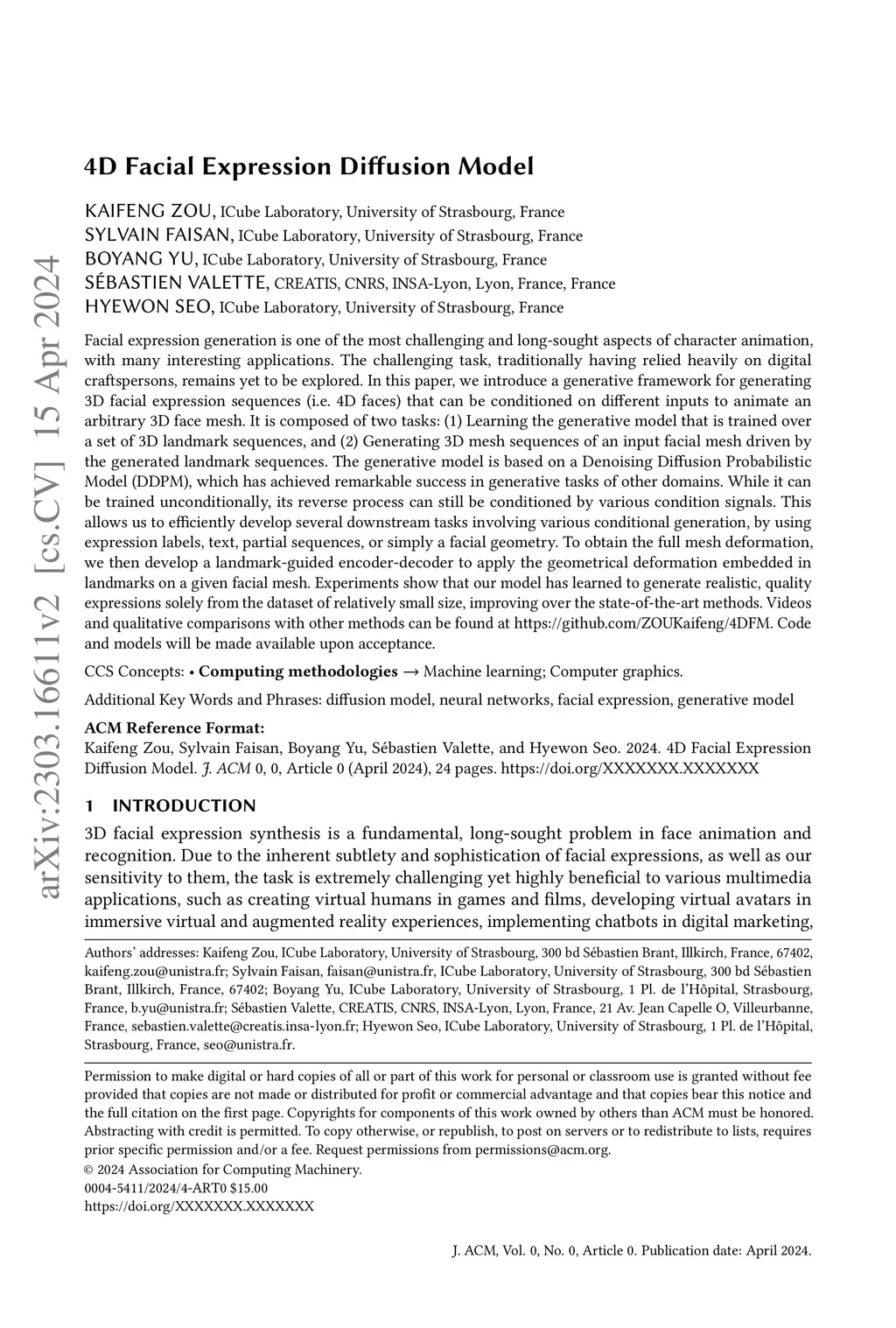 Facial expression generation is one of the most challenging and long-sought aspects of character animation, with many interesting applications. The challenging task, traditionally having relied heavily on digital craftspersons, remains yet to be explored. In this paper, we introduce a generative framework for generating 3D facial expression sequences (i.e. 4D faces) that can be conditioned on different inputs to animate an arbitrary 3D face mesh. It is composed of two tasks: (1) Learning the generative model that is trained over a set of 3D landmark sequences, and (2) Generating 3D mesh sequences of an input facial mesh driven by the generated landmark sequences. The generative model is based on a Denoising Diffusion Probabilistic Model (DDPM), which has achieved remarkable success in generative tasks of other domains. While it can be trained unconditionally, its reverse process can still be conditioned by various condition signals. This allows us to efficiently develop several downstream tasks involving various conditional generation, by using expression labels, text, partial sequences, or simply a facial geometry. To obtain the full mesh deformation, we then develop a landmark-guided encoder-decoder to apply the geometrical deformation embedded in landmarks on a given facial mesh. Experiments show that our model has learned to generate realistic, quality expressions solely from the dataset of relatively small size, improving over the state-of-the-art methods. Videos and qualitative comparisons with other methods can be found at \url{https://github.com/ZOUKaifeng/4DFM}.