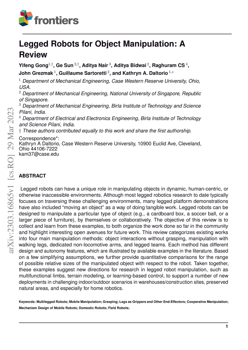 Legged Robots for Object Manipulation: A Review