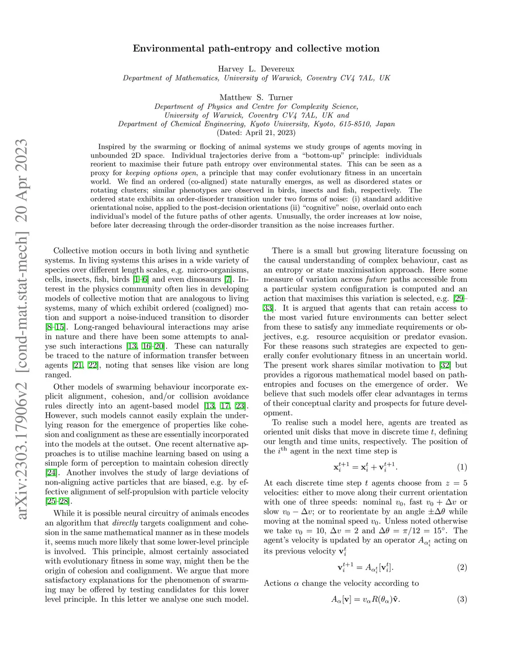 Inspired by the swarming or flocking of animal systems we study groups of agents moving in unbounded 2D space. Individual trajectories derive from a ``bottom-up'' principle: individuals reorient to maximise their future path entropy over environmental states. This can be seen as a proxy for keeping options open, a principle that may confer evolutionary fitness in an uncertain world. We find an ordered (co-aligned) state naturally emerges, as well as disordered states or rotating clusters; similar phenotypes are observed in birds, insects and fish, respectively. The ordered state exhibits an order-disorder transition under two forms of noise: (i) standard additive orientational noise, applied to the post-decision orientations (ii) ``cognitive'' noise, overlaid onto each individual's model of the future paths of other agents. Unusually, the order increases at low noise, before later decreasing through the order-disorder transition as the noise increases further.