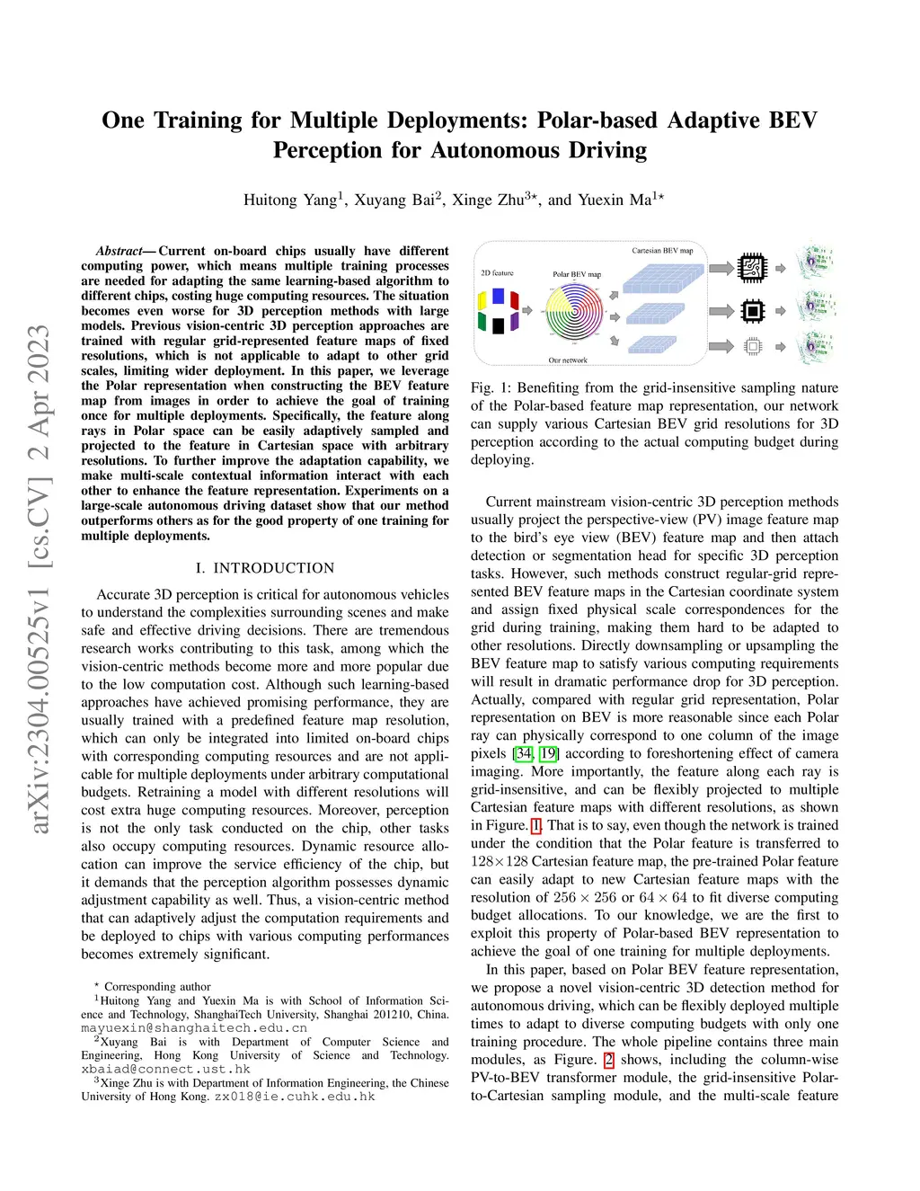 Current on-board chips usually have different computing power, which means multiple training processes are needed for adapting the same learning-based algorithm to different chips, costing huge computing resources. The situation becomes even worse for 3D perception methods with large models. Previous vision-centric 3D perception approaches are trained with regular grid-represented feature maps of fixed resolutions, which is not applicable to adapt to other grid scales, limiting wider deployment. In this paper, we leverage the Polar representation when constructing the BEV feature map from images in order to achieve the goal of training once for multiple deployments. Specifically, the feature along rays in Polar space can be easily adaptively sampled and projected to the feature in Cartesian space with arbitrary resolutions. To further improve the adaptation capability, we make multi-scale contextual information interact with each other to enhance the feature representation. Experiments on a large-scale autonomous driving dataset show that our method outperforms others as for the good property of one training for multiple deployments.