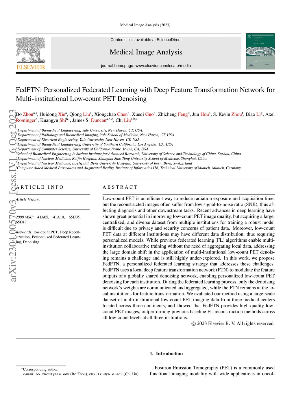 Low-count PET is an efficient way to reduce radiation exposure and acquisition time, but the reconstructed images often suffer from low signal-to-noise ratio (SNR), thus affecting diagnosis and other downstream tasks. Recent advances in deep learning have shown great potential in improving low-count PET image quality, but acquiring a large, centralized, and diverse dataset from multiple institutions for training a robust model is difficult due to privacy and security concerns of patient data. Moreover, low-count PET data at different institutions may have different data distribution, thus requiring personalized models. While previous federated learning (FL) algorithms enable multi-institution collaborative training without the need of aggregating local data, addressing the large domain shift in the application of multi-institutional low-count PET denoising remains a challenge and is still highly under-explored. In this work, we propose FedFTN, a personalized federated learning strategy that addresses these challenges. FedFTN uses a local deep feature transformation network (FTN) to modulate the feature outputs of a globally shared denoising network, enabling personalized low-count PET denoising for each institution. During the federated learning process, only the denoising network's weights are communicated and aggregated, while the FTN remains at the local institutions for feature transformation. We evaluated our method using a large-scale dataset of multi-institutional low-count PET imaging data from three medical centers located across three continents, and showed that FedFTN provides high-quality low-count PET images, outperforming previous baseline FL reconstruction methods across all low-count levels at all three institutions.