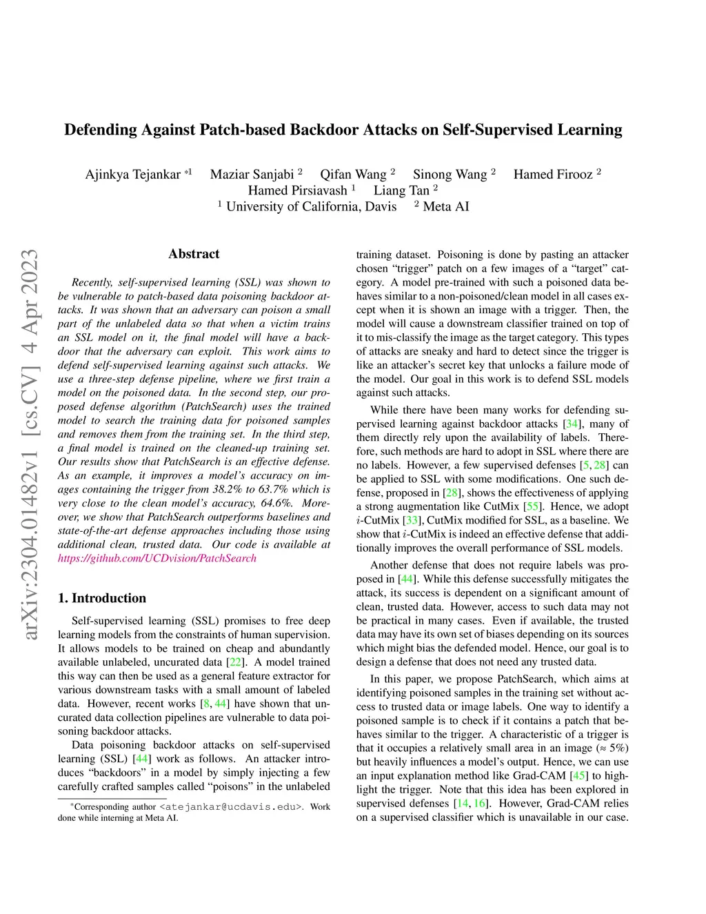 Recently, self-supervised learning (SSL) was shown to be vulnerable to patch-based data poisoning backdoor attacks. It was shown that an adversary can poison a small part of the unlabeled data so that when a victim trains an SSL model on it, the final model will have a backdoor that the adversary can exploit. This work aims to defend self-supervised learning against such attacks. We use a three-step defense pipeline, where we first train a model on the poisoned data. In the second step, our proposed defense algorithm (PatchSearch) uses the trained model to search the training data for poisoned samples and removes them from the training set. In the third step, a final model is trained on the cleaned-up training set. Our results show that PatchSearch is an effective defense. As an example, it improves a model's accuracy on images containing the trigger from 38.2% to 63.7% which is very close to the clean model's accuracy, 64.6%. Moreover, we show that PatchSearch outperforms baselines and state-of-the-art defense approaches including those using additional clean, trusted data. Our code is available at https://github.com/UCDvision/PatchSearch