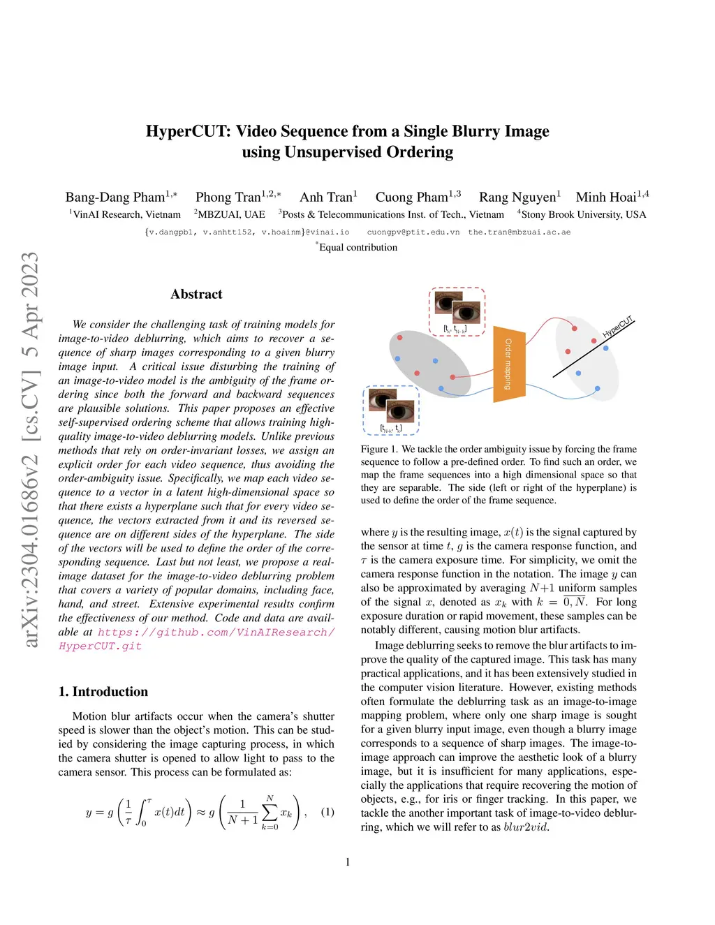 We consider the challenging task of training models for image-to-video deblurring, which aims to recover a sequence of sharp images corresponding to a given blurry image input. A critical issue disturbing the training of an image-to-video model is the ambiguity of the frame ordering since both the forward and backward sequences are plausible solutions. This paper proposes an effective self-supervised ordering scheme that allows training high-quality image-to-video deblurring models. Unlike previous methods that rely on order-invariant losses, we assign an explicit order for each video sequence, thus avoiding the order-ambiguity issue. Specifically, we map each video sequence to a vector in a latent high-dimensional space so that there exists a hyperplane such that for every video sequence, the vectors extracted from it and its reversed sequence are on different sides of the hyperplane. The side of the vectors will be used to define the order of the corresponding sequence. Last but not least, we propose a real-image dataset for the image-to-video deblurring problem that covers a variety of popular domains, including face, hand, and street. Extensive experimental results confirm the effectiveness of our method. Code and data are available at https://github.com/VinAIResearch/HyperCUT.git