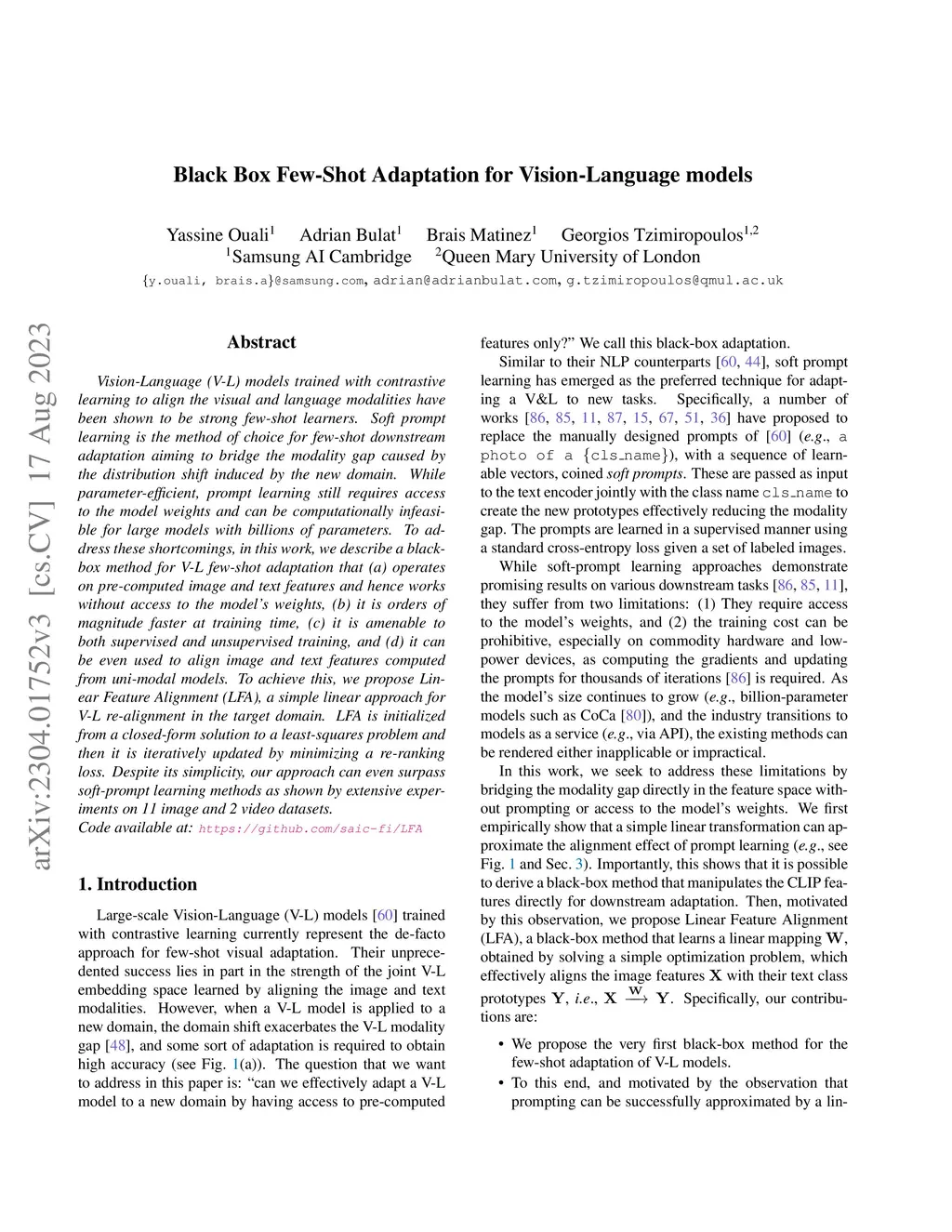 Vision-Language (V-L) models trained with contrastive learning to align the visual and language modalities have been shown to be strong few-shot learners. Soft prompt learning is the method of choice for few-shot downstream adaptation aiming to bridge the modality gap caused by the distribution shift induced by the new domain. While parameter-efficient, prompt learning still requires access to the model weights and can be computationally infeasible for large models with billions of parameters. To address these shortcomings, in this work, we describe a black-box method for V-L few-shot adaptation that (a) operates on pre-computed image and text features and hence works without access to the model's weights, (b) it is orders of magnitude faster at training time, (c) it is amenable to both supervised and unsupervised training, and (d) it can be even used to align image and text features computed from uni-modal models. To achieve this, we propose Linear Feature Alignment (LFA), a simple linear approach for V-L re-alignment in the target domain. LFA is initialized from a closed-form solution to a least-squares problem and then it is iteratively updated by minimizing a re-ranking loss. Despite its simplicity, our approach can even surpass soft-prompt learning methods as shown by extensive experiments on 11 image and 2 video datasets.