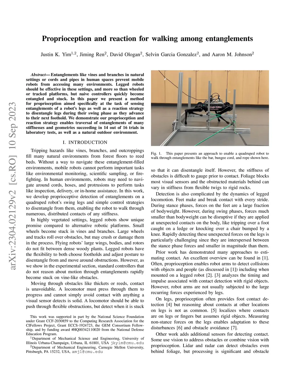 Entanglements like vines and branches in natural settings or cords and pipes in human spaces prevent mobile robots from accessing many environments. Legged robots should be effective in these settings, and more so than wheeled or tracked platforms, but naive controllers quickly become entangled and stuck. In this paper we present a method for proprioception aimed specifically at the task of sensing entanglements of a robot's legs as well as a reaction strategy to disentangle legs during their swing phase as they advance to their next foothold. We demonstrate our proprioception and reaction strategy enables traversal of entanglements of many stiffnesses and geometries succeeding in 14 out of 16 trials in laboratory tests, as well as a natural outdoor environment.