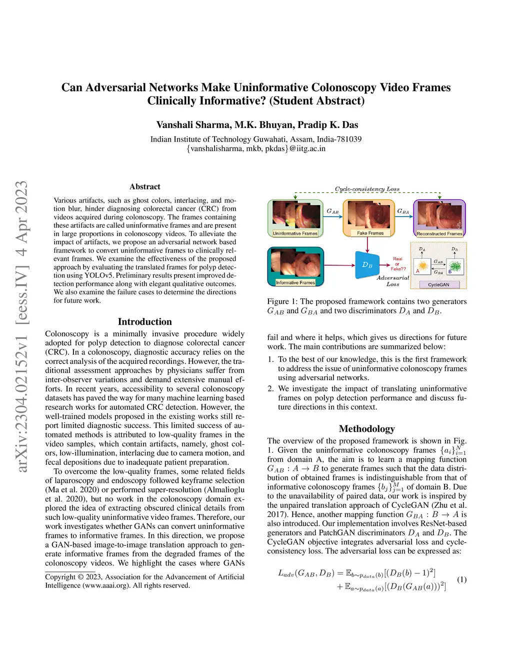 Various artifacts, such as ghost colors, interlacing, and motion blur, hinder diagnosing colorectal cancer (CRC) from videos acquired during colonoscopy. The frames containing these artifacts are called uninformative frames and are present in large proportions in colonoscopy videos. To alleviate the impact of artifacts, we propose an adversarial network based framework to convert uninformative frames to clinically relevant frames. We examine the effectiveness of the proposed approach by evaluating the translated frames for polyp detection using YOLOv5. Preliminary results present improved detection performance along with elegant qualitative outcomes. We also examine the failure cases to determine the directions for future work.