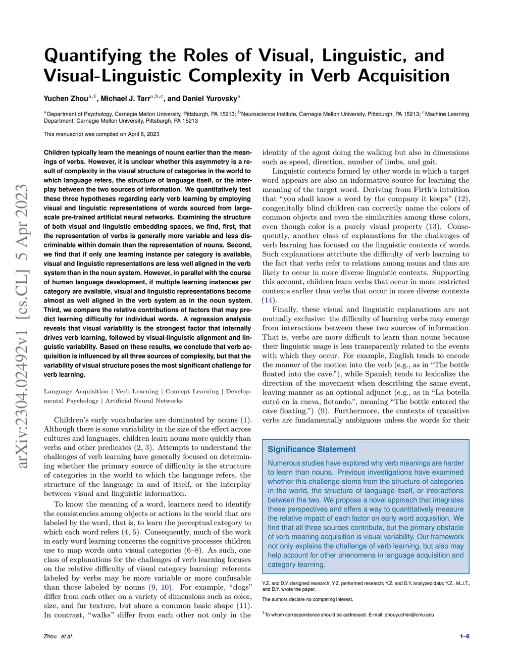 Children typically learn the meanings of nouns earlier than the meanings of verbs. However, it is unclear whether this asymmetry is a result of complexity in the visual structure of categories in the world to which language refers, the structure of language itself, or the interplay between the two sources of information. We quantitatively test these three hypotheses regarding early verb learning by employing visual and linguistic representations of words sourced from large-scale pre-trained artificial neural networks. Examining the structure of both visual and linguistic embedding spaces, we find, first, that the representation of verbs is generally more variable and less discriminable within domain than the representation of nouns. Second, we find that if only one learning instance per category is available, visual and linguistic representations are less well aligned in the verb system than in the noun system. However, in parallel with the course of human language development, if multiple learning instances per category are available, visual and linguistic representations become almost as well aligned in the verb system as in the noun system. Third, we compare the relative contributions of factors that may predict learning difficulty for individual words. A regression analysis reveals that visual variability is the strongest factor that internally drives verb learning, followed by visual-linguistic alignment and linguistic variability. Based on these results, we conclude that verb acquisition is influenced by all three sources of complexity, but that the variability of visual structure poses the most significant challenge for verb learning.