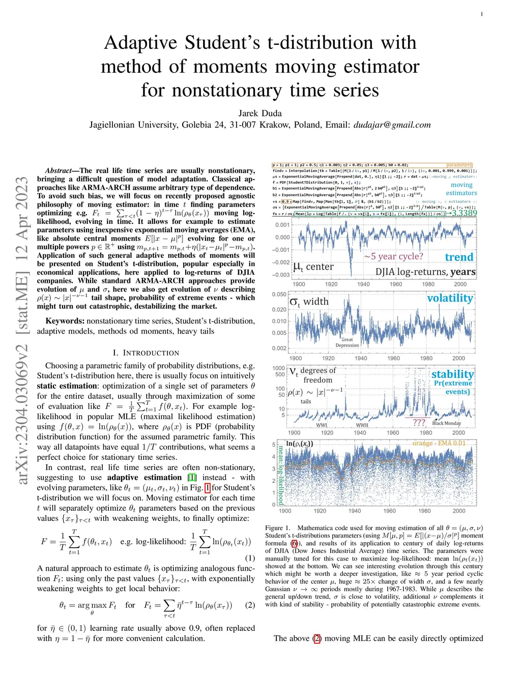 The real life time series are usually nonstationary, bringing a difficult question of model adaptation. Classical approaches like ARMA-ARCH assume arbitrary type of dependence. To avoid their bias, we will focus on recently proposed agnostic philosophy of moving estimator: in time finding parameters optimizing e.g. moving log-likelihood, evolving in time. It allows for example to estimate parameters using inexpensive exponential moving averages (EMA), like absolute central moments evolving for one or multiple powers using . Application of such general adaptive methods of moments will be presented on Student's t-distribution, popular especially in economical applications, here applied to log-returns of DJIA companies. While standard ARMA-ARCH approaches provide evolution of and , here we also get evolution of describing tail shape, probability of extreme events - which might turn out catastrophic, destabilizing the market.