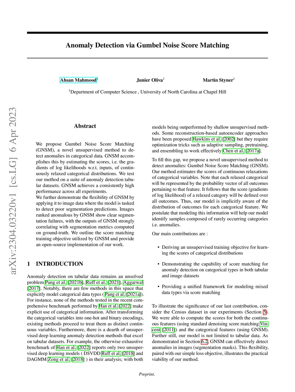 We propose Gumbel Noise Score Matching (GNSM), a novel unsupervised method to detect anomalies in categorical data. GNSM accomplishes this by estimating the scores, i.e. the gradients of log likelihoods w.r.t.~inputs, of continuously relaxed categorical distributions. We test our method on a suite of anomaly detection tabular datasets. GNSM achieves a consistently high performance across all experiments. We further demonstrate the flexibility of GNSM by applying it to image data where the model is tasked to detect poor segmentation predictions. Images ranked anomalous by GNSM show clear segmentation failures, with the outputs of GNSM strongly correlating with segmentation metrics computed on ground-truth. We outline the score matching training objective utilized by GNSM and provide an open-source implementation of our work.