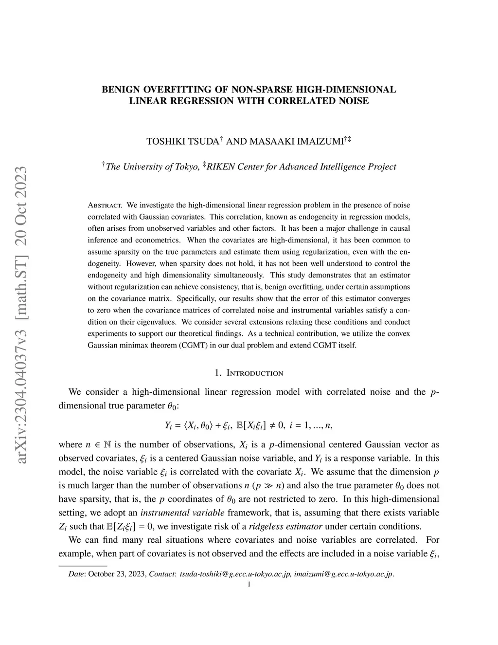 We investigate the high-dimensional linear regression problem in the presence of noise correlated with Gaussian covariates. This correlation, known as endogeneity in regression models, often arises from unobserved variables and other factors. It has been a major challenge in causal inference and econometrics. When the covariates are high-dimensional, it has been common to assume sparsity on the true parameters and estimate them using regularization, even with the endogeneity. However, when sparsity does not hold, it has not been well understood to control the endogeneity and high dimensionality simultaneously. This study demonstrates that an estimator without regularization can achieve consistency, that is, benign overfitting, under certain assumptions on the covariance matrix. Specifically, our results show that the error of this estimator converges to zero when the covariance matrices of correlated noise and instrumental variables satisfy a condition on their eigenvalues. We consider several extensions relaxing these conditions and conduct experiments to support our theoretical findings. As a technical contribution, we utilize the convex Gaussian minimax theorem (CGMT) in our dual problem and extend CGMT itself.