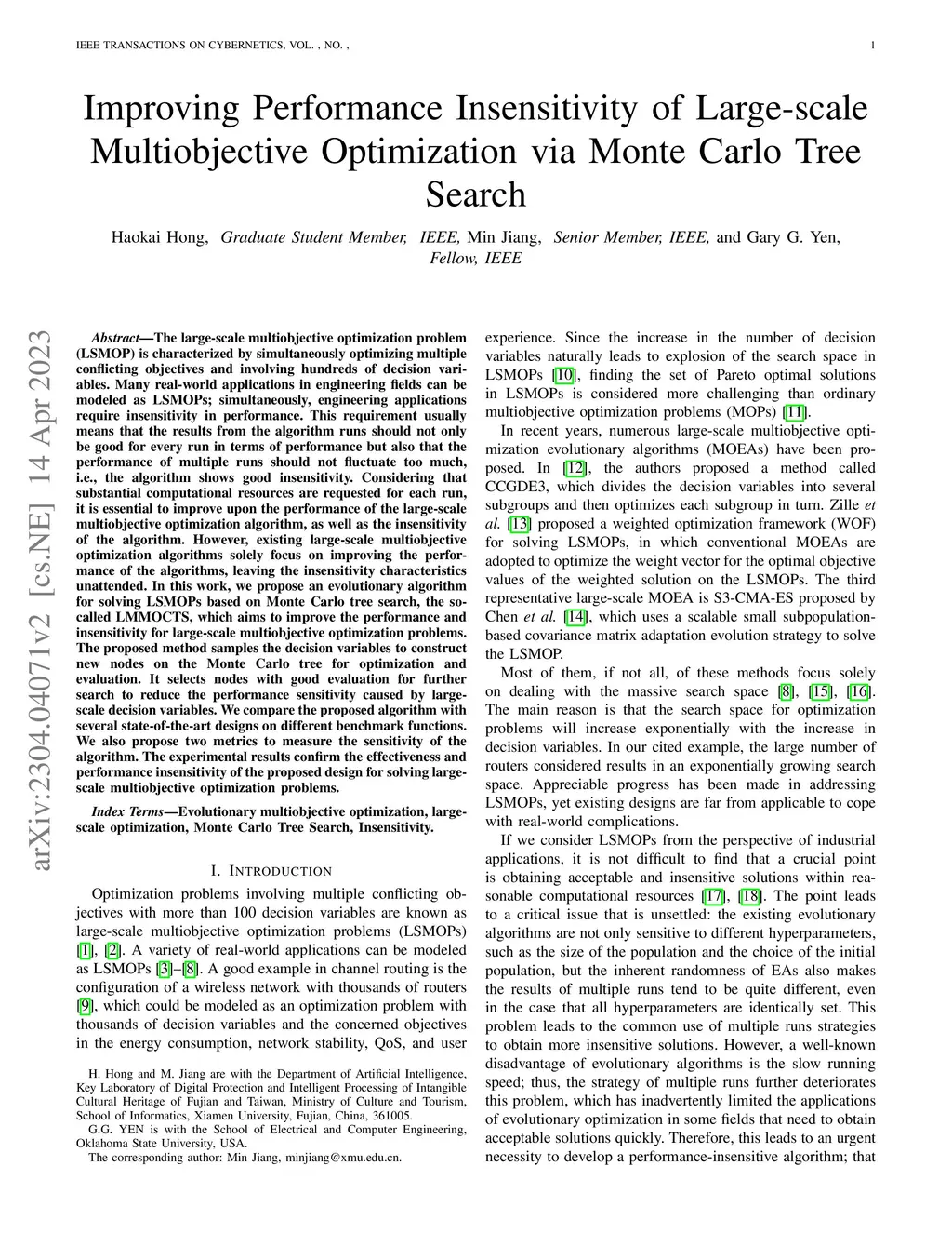 The large-scale multiobjective optimization problem (LSMOP) is characterized by simultaneously optimizing multiple conflicting objectives and involving hundreds of decision variables. Many real-world applications in engineering fields can be modeled as LSMOPs; simultaneously, engineering applications require insensitivity in performance. This requirement usually means that the results from the algorithm runs should not only be good for every run in terms of performance but also that the performance of multiple runs should not fluctuate too much, i.e., the algorithm shows good insensitivity. Considering that substantial computational resources are requested for each run, it is essential to improve upon the performance of the large-scale multiobjective optimization algorithm, as well as the insensitivity of the algorithm. However, existing large-scale multiobjective optimization algorithms solely focus on improving the performance of the algorithms, leaving the insensitivity characteristics unattended. In this work, we propose an evolutionary algorithm for solving LSMOPs based on Monte Carlo tree search, the so-called LMMOCTS, which aims to improve the performance and insensitivity for large-scale multiobjective optimization problems. The proposed method samples the decision variables to construct new nodes on the Monte Carlo tree for optimization and evaluation. It selects nodes with good evaluation for further search to reduce the performance sensitivity caused by large-scale decision variables. We compare the proposed algorithm with several state-of-the-art designs on different benchmark functions. We also propose two metrics to measure the sensitivity of the algorithm. The experimental results confirm the effectiveness and performance insensitivity of the proposed design for solving large-scale multiobjective optimization problems.