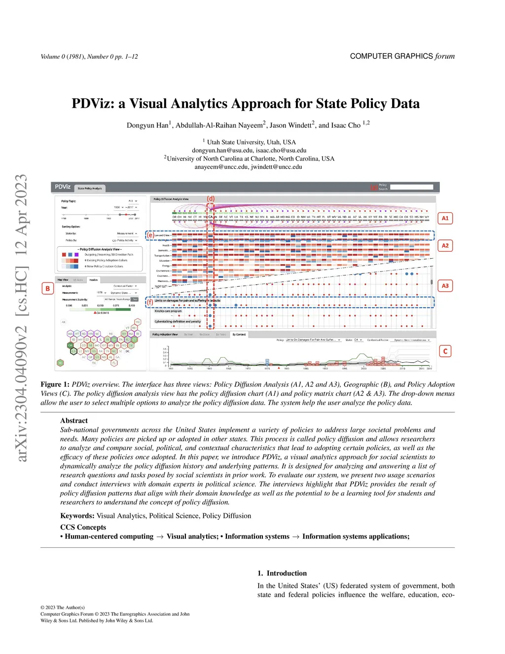 Sub-national governments across the United States implement a variety of policies to address large societal problems and needs. Many policies are picked up or adopted in other states. This process is called policy diffusion and allows researchers to analyze and compare social, political, and contextual characteristics that lead to adopting certain policies, as well as the efficacy of these policies once adopted. In this paper, we introduce PDViz, a visual analytics approach for social scientists to dynamically analyze the policy diffusion history and underlying patterns. It is designed for analyzing and answering a list of research questions and tasks posed by social scientists in prior work. To evaluate our system, we present two usage scenarios and conduct interviews with domain experts in political science. The interviews highlight that PDViz provides the result of policy diffusion patterns that align with their domain knowledge as well as the potential to be a learning tool for students and researchers to understand the concept of policy diffusion.