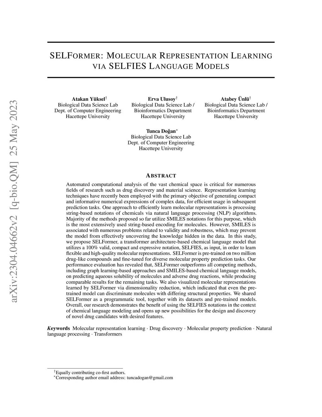 SELFormer: Molecular Representation Learning via SELFIES Language Models