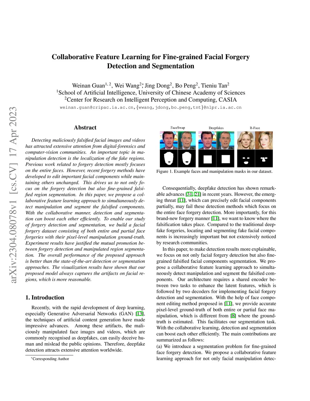 Detecting maliciously falsified facial images and videos has attracted extensive attention from digital-forensics and computer-vision communities. An important topic in manipulation detection is the localization of the fake regions. Previous work related to forgery detection mostly focuses on the entire faces. However, recent forgery methods have developed to edit important facial components while maintaining others unchanged. This drives us to not only focus on the forgery detection but also fine-grained falsified region segmentation. In this paper, we propose a collaborative feature learning approach to simultaneously detect manipulation and segment the falsified components. With the collaborative manner, detection and segmentation can boost each other efficiently. To enable our study of forgery detection and segmentation, we build a facial forgery dataset consisting of both entire and partial face forgeries with their pixel-level manipulation ground-truth. Experiment results have justified the mutual promotion between forgery detection and manipulated region segmentation. The overall performance of the proposed approach is better than the state-of-the-art detection or segmentation approaches. The visualization results have shown that our proposed model always captures the artifacts on facial regions, which is more reasonable.